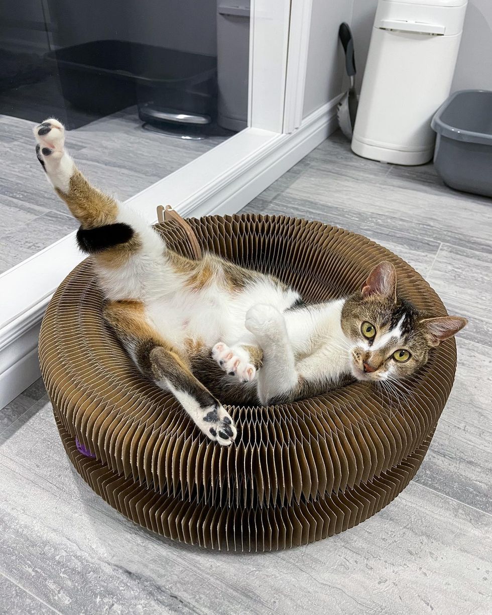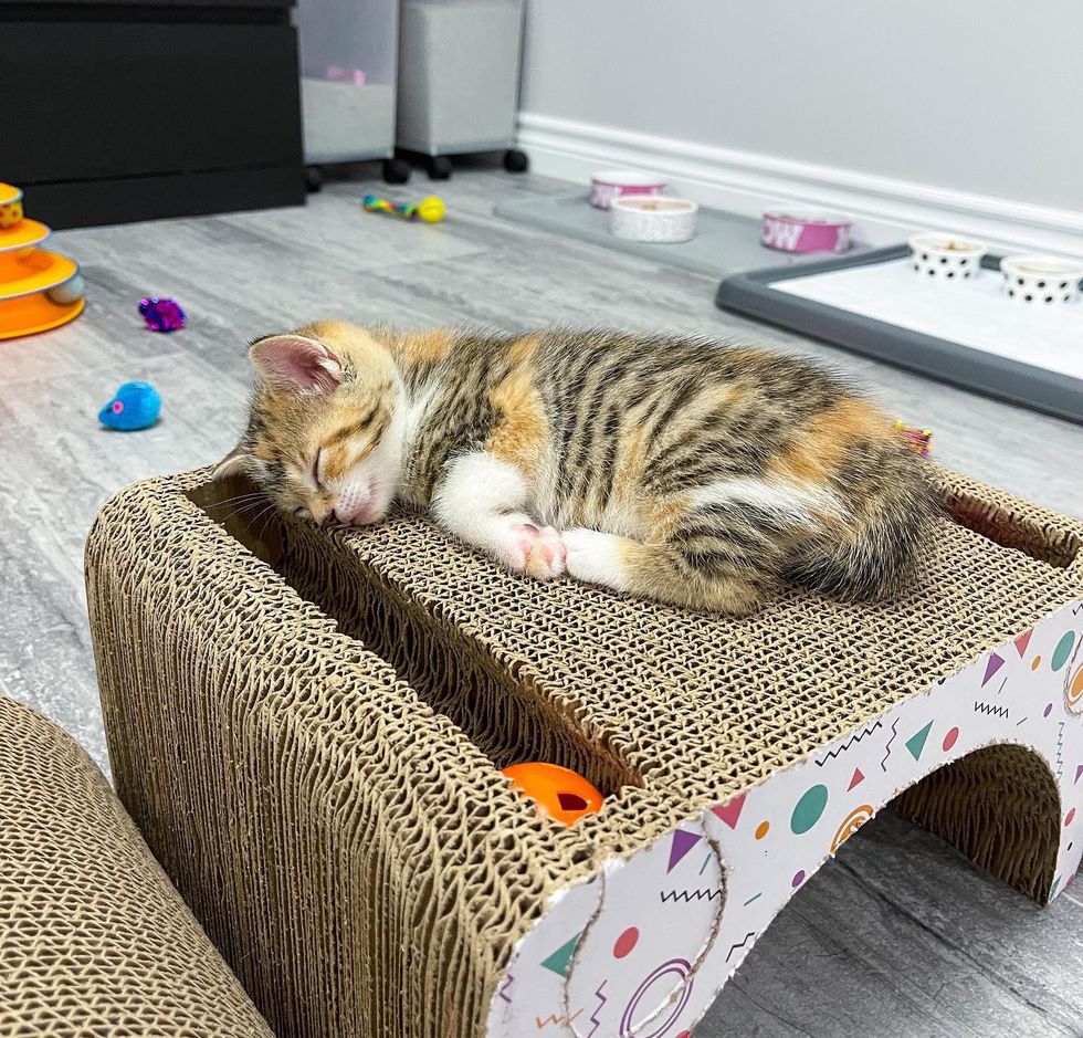 Maci who has taken the role of big sister, was the first to nap on a large scratcher and in the new hammock. She quickly got her siblings to join in.
