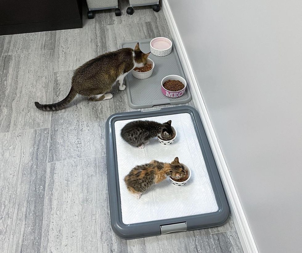It didn't take long for Maci to follow suit and learn to eat like a big kitty. One thing led to another, Evie, the grey and white kitten, also joined the breakfast club.