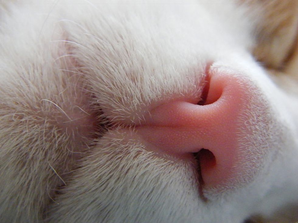Cats' nose leather is a bit tough since it is often used to contact with random objects. There are mainly 2 nose leather colors: pink and black. Some cats have primarily a pink nose pad with black speckles scattered around. Cats nose leather is similar to human finger prints. No feline noseprints are ever alike.