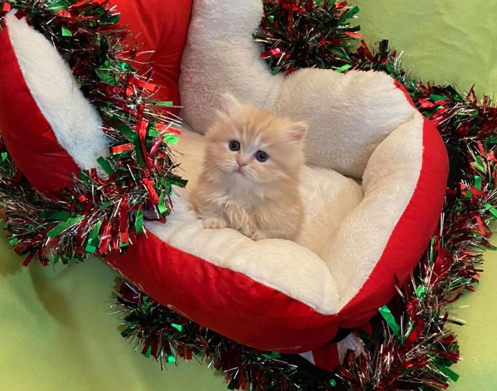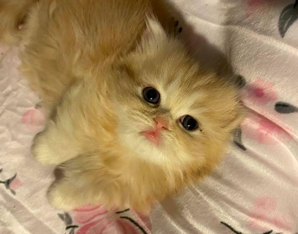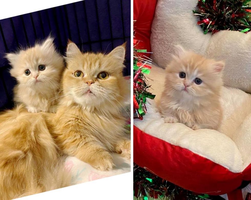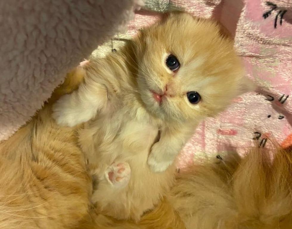 A few days after arrival, Gucci went into labor and had one surviving kitten named Versace. The little ginger (girl) immediately latched onto her mom and blended into her long fur. "She is absolutely stunning, just like her mama. She was a large sized kitten even for a normal cat (Gucci is only five pounds)."
