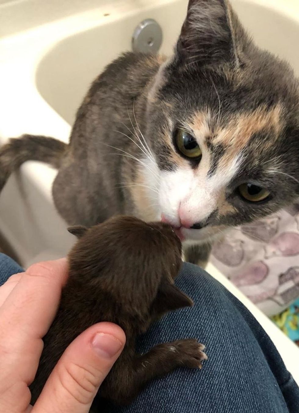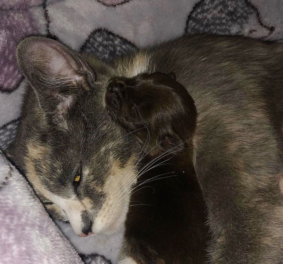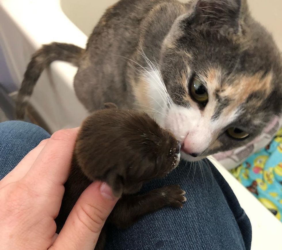 A rescued cat mother met a tiny orphaned puppy. She immediately took to him as her own.