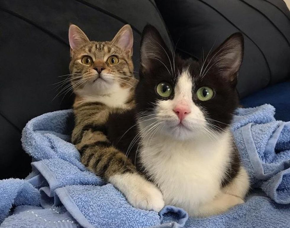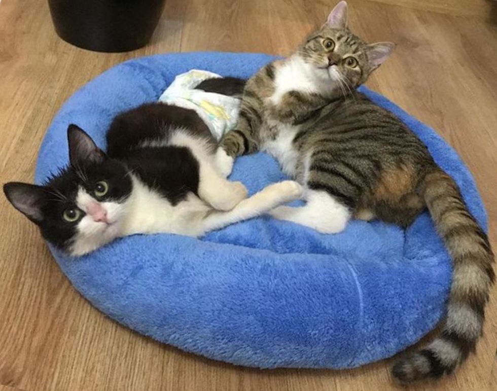 The tripod kitty took the tuxedo under her wing and watched over him every step of the way. "They like to spend time together, playing, grooming each other and sleeping in the same bed."