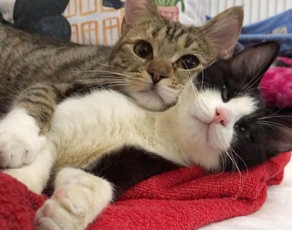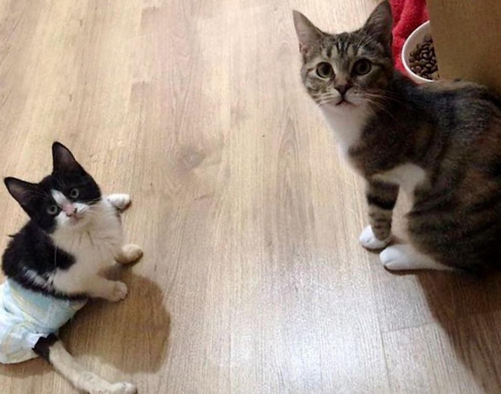 A cat with three paws took to a kitten who walks on his front legs. They instantly bonded.