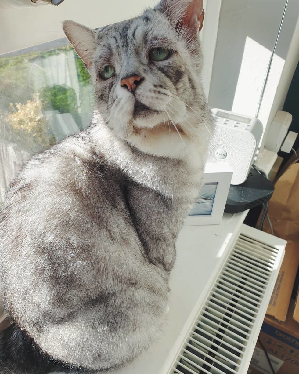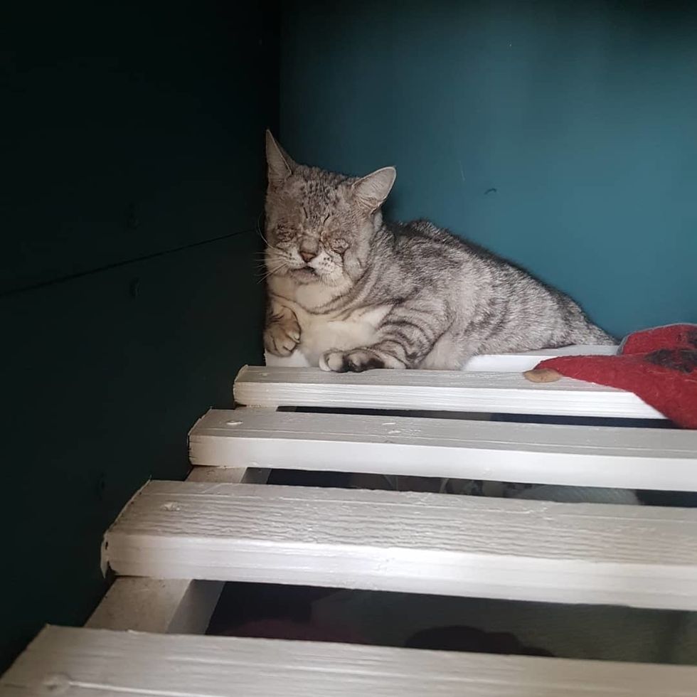 "When we adopted him, he weighed 5.7kg (12.6 lb) despite being a small cat — this is because of his excess skin. Toby is a very happy, healthy boy who is incredibly loved."