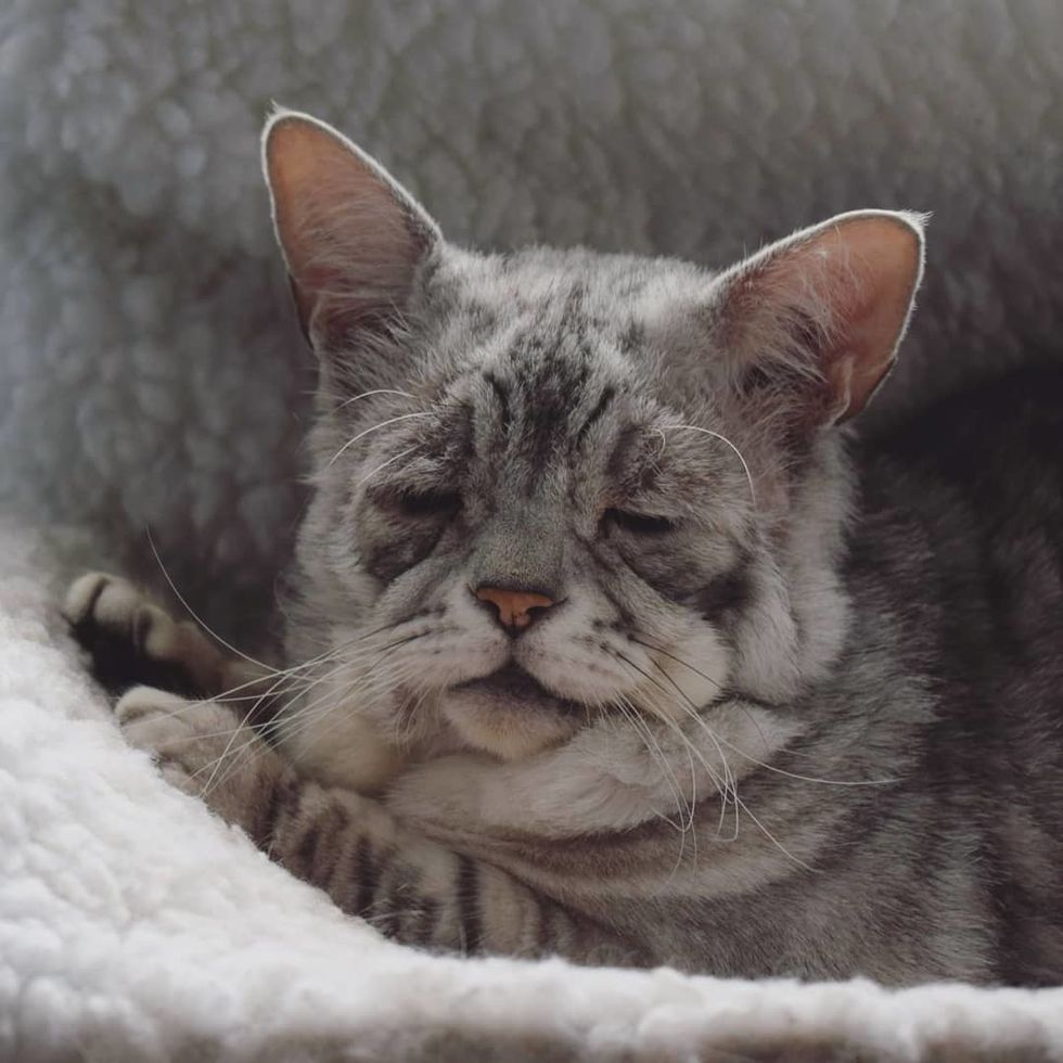 Toby the cat is six years old and looks wise beyond his age. He has feline cutaneous asthenia (FCA), a condition in which the cat's skin is very fragile, loose and easily bruised, also known as Ehlers-Danlos syndrome in humans.
