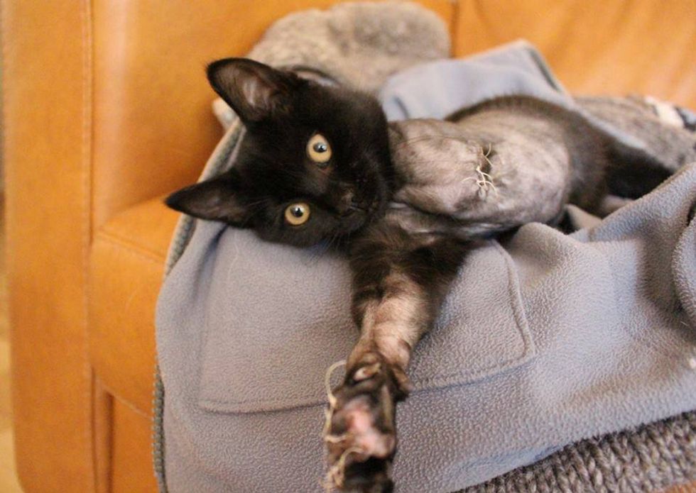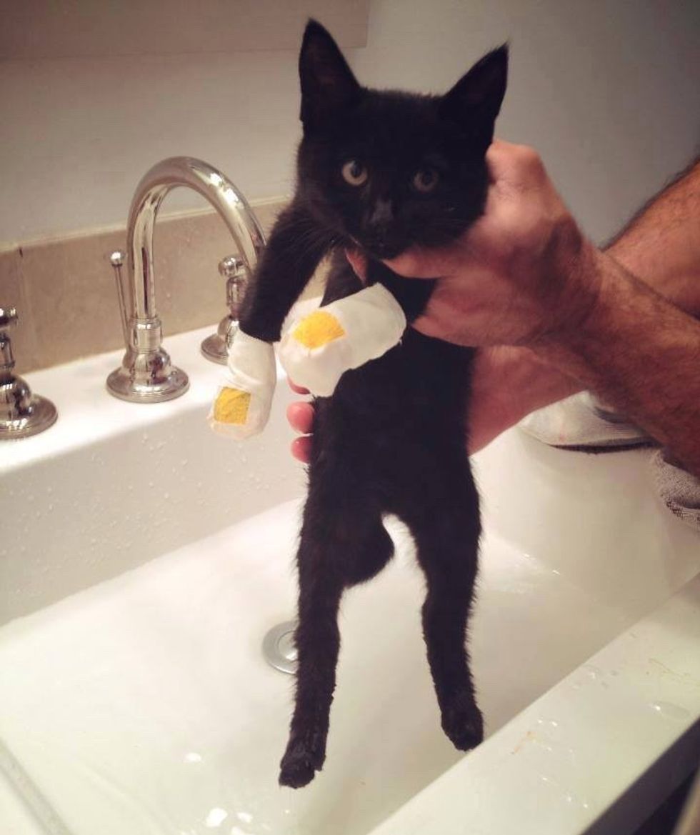 When he inspected the kitten's injuries, he was shocked by just how bad her two front paws were. He rushed the kitten to the vet where they bandaged her up and scheduled her for surgery. "She needed to have her front leg and some toes on her right front paw amputated."