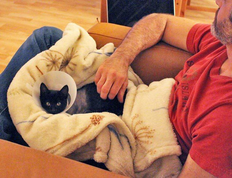 After the life-saving surgery, Shadow reached out her paw for a cuddle.