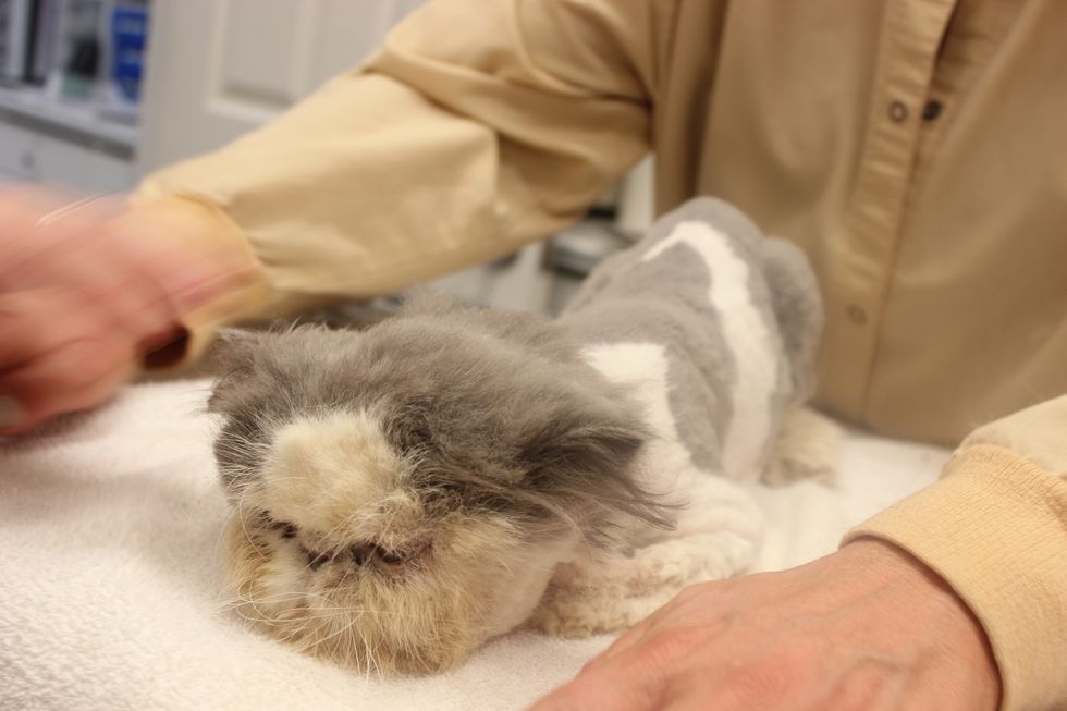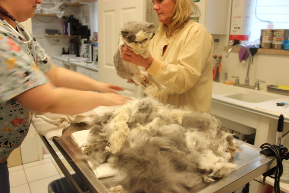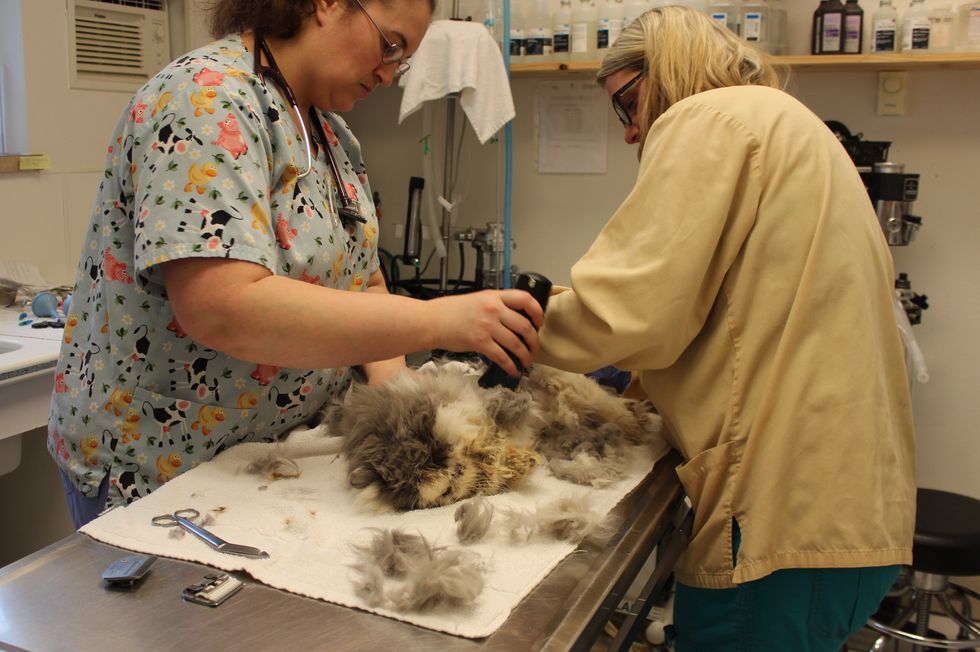 Dr. Leslie Kasper (Lead Shelter Veterinarian) and MJ Zelinka (Operations Manager and LVT) worked together to shave off all the knots and matted fur.