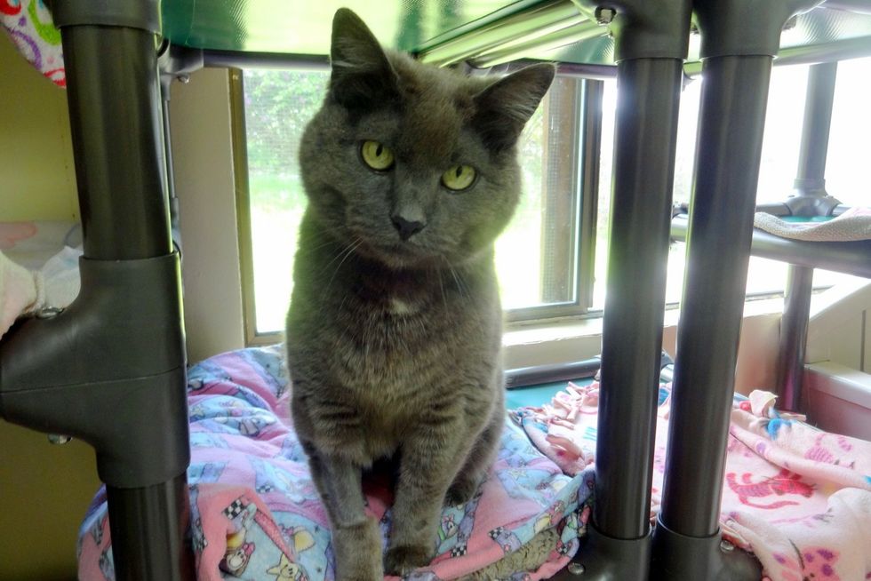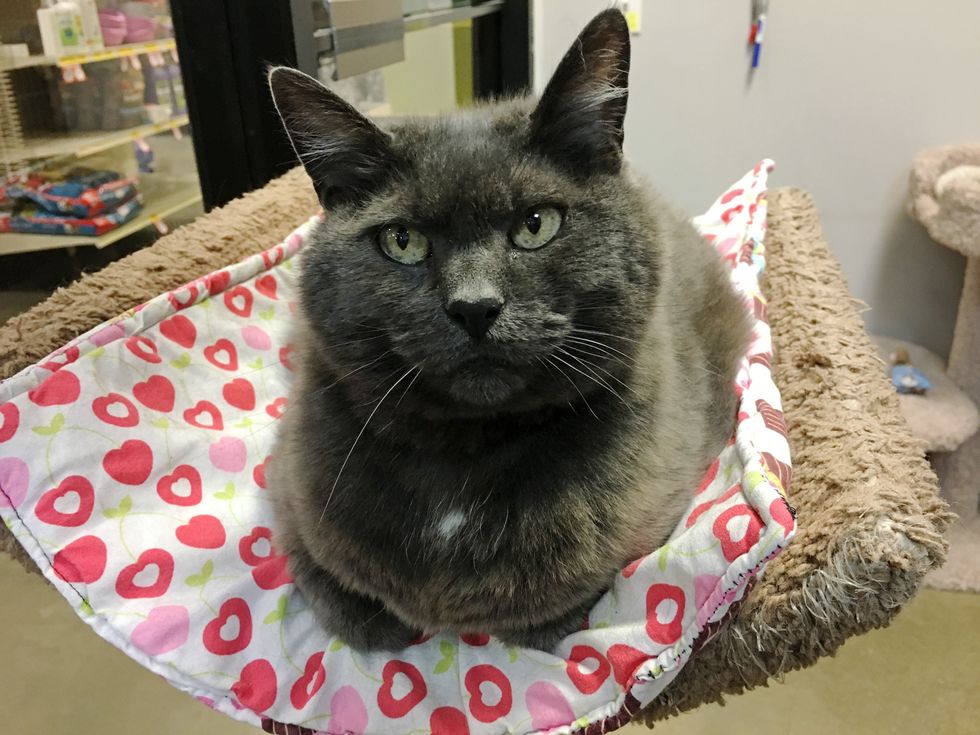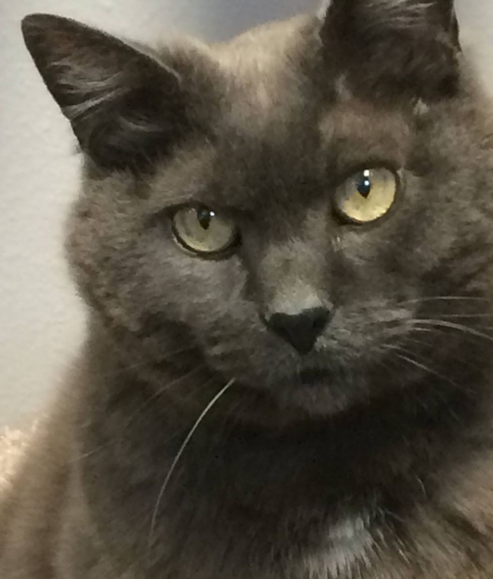 "This slate-gray 12 year-old girl with the tiny 'charm' of white fur on her chest is hesitant with new people and situations but once she feels safe, she loves your attention," Purrfect Pals said.