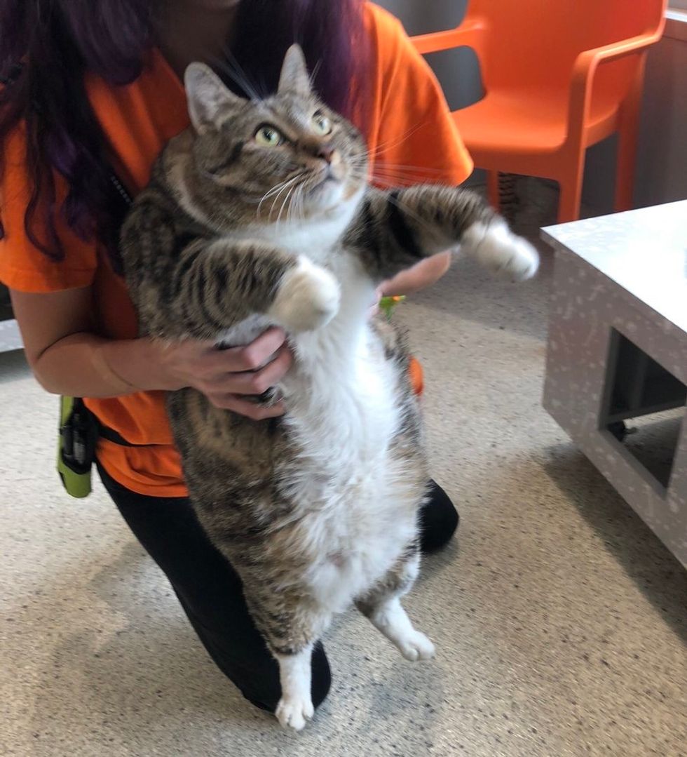 The sweet and outgoing tabby charmed everyone at the shelter. "Big Doughnut is 28.6 pounds and very thick. His new family will need to work with a vet to get him to the right weight at the right pace."