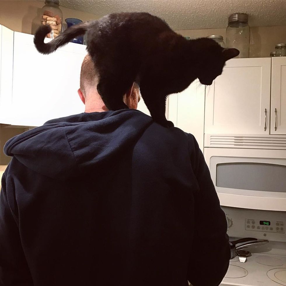 Mikita likes to "help" in the kitchen by jumping on their shoulders and watching them cook.