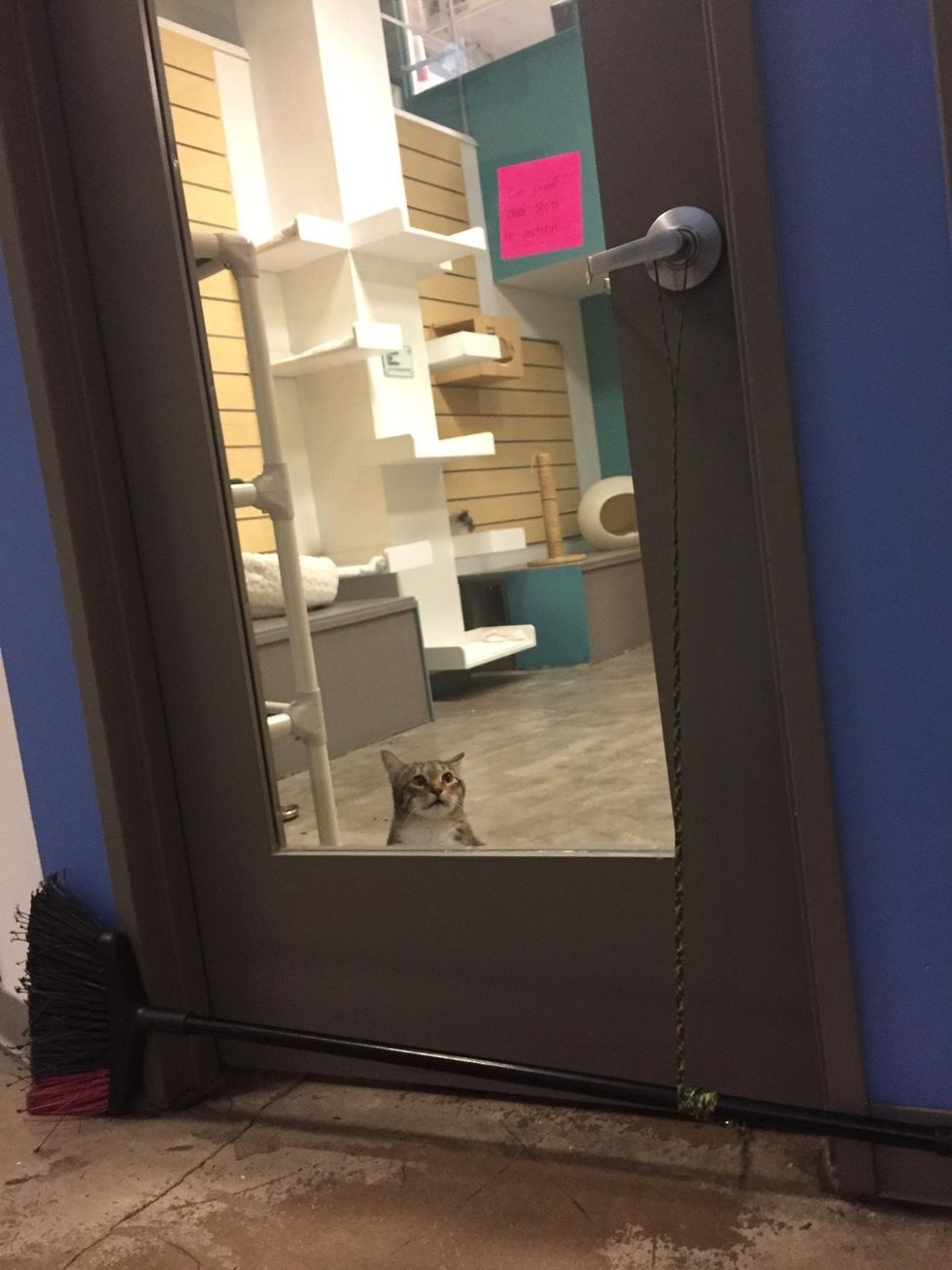 The shelter uses lever handles on the cat room doors and have never had this issue until now. "Lever handles are easier for visitors with disabilities to open than round handles. (Now,) we had to figure out something to keep the door closed."