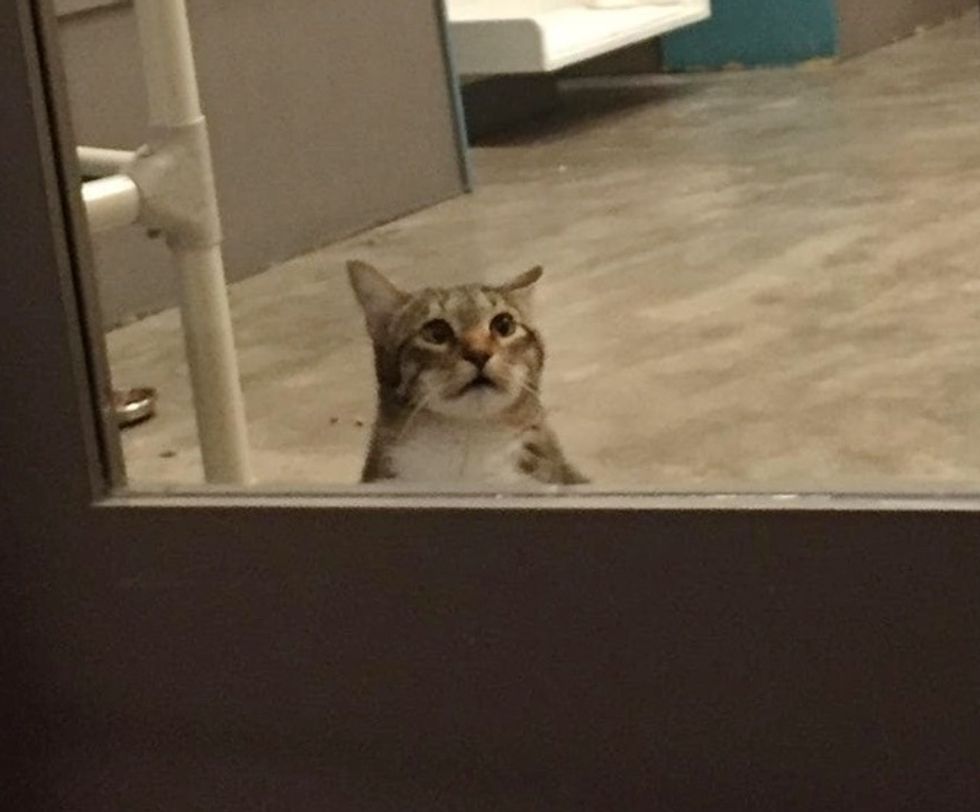 The shelter took him back with open arms and placed him in a kitty suite with a few other feline roommates. But little did they know this tabby boy has zero tolerance to closed doors.