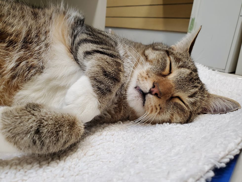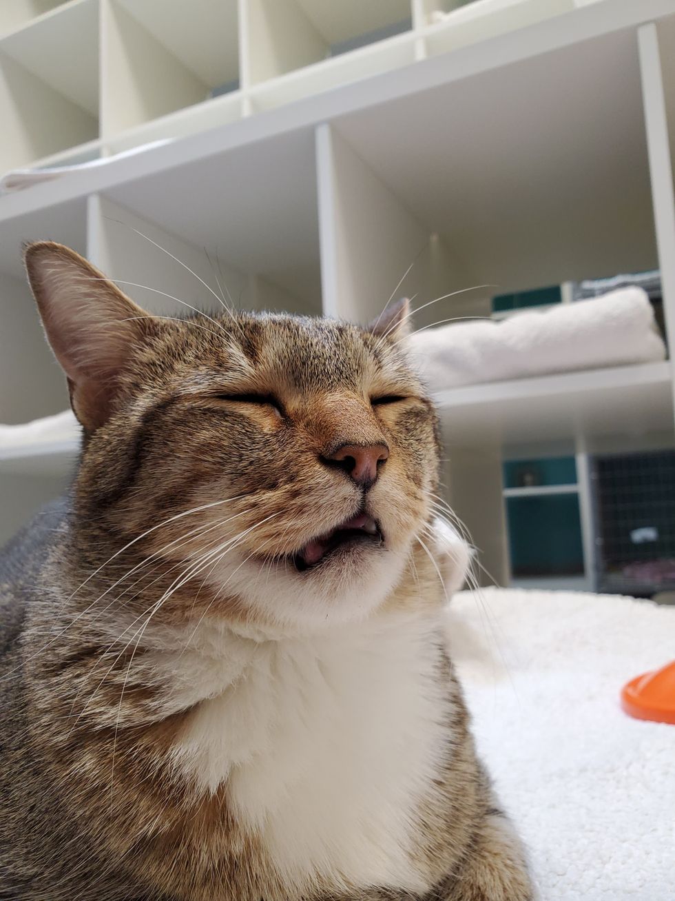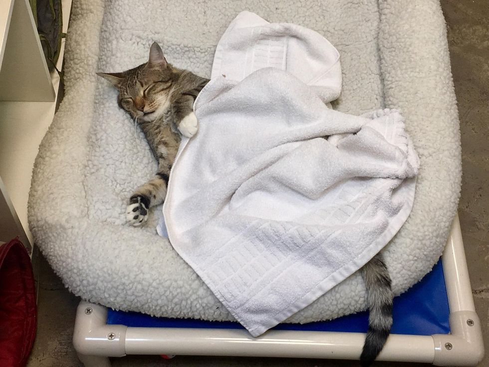 "Right now, his favorite thing to do is lay by the door so that he can follow unsuspecting volunteers out of it when they open the door," Jennifer told Love Meow. "He also enjoys napping around the room, and will pull rugs and towels on top of him as a blanket."
