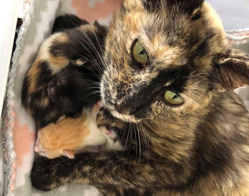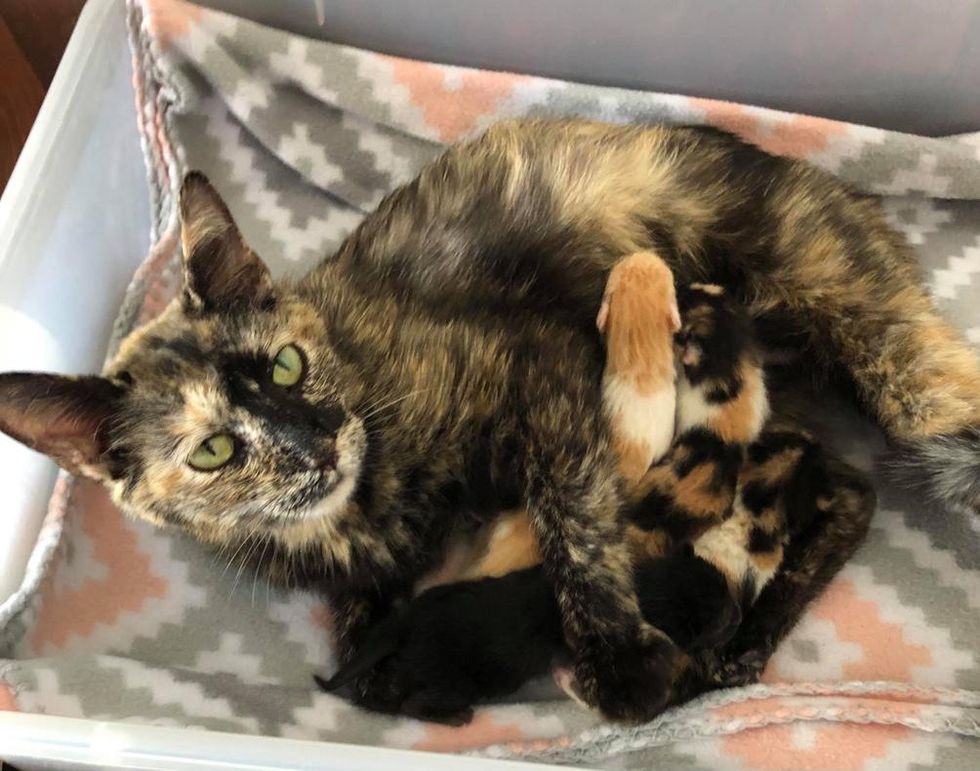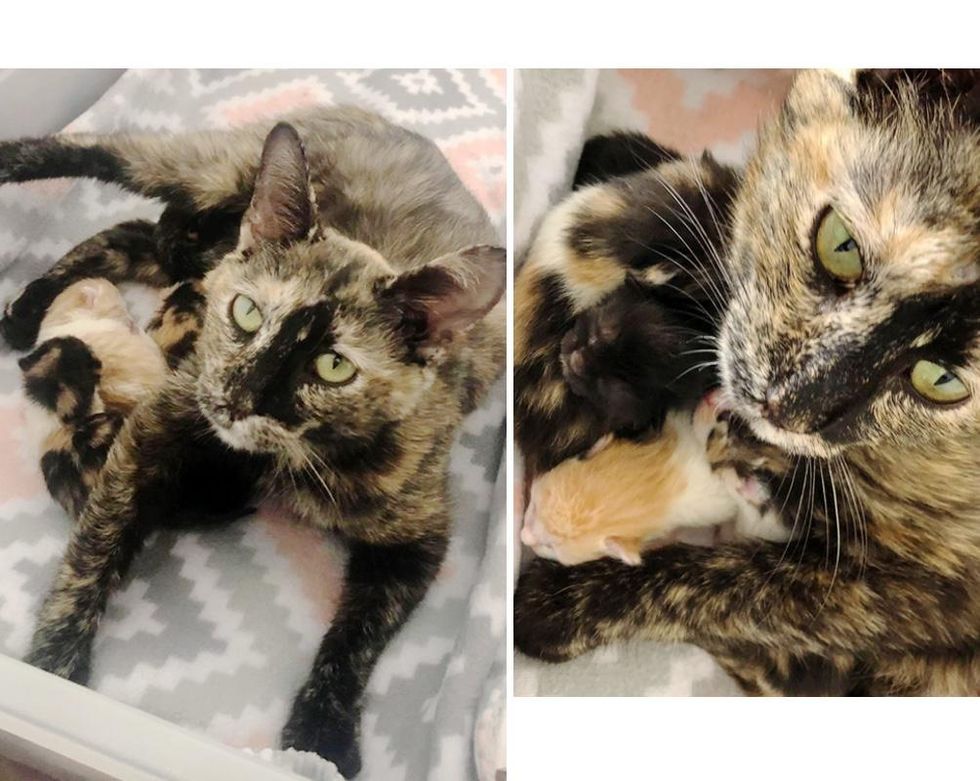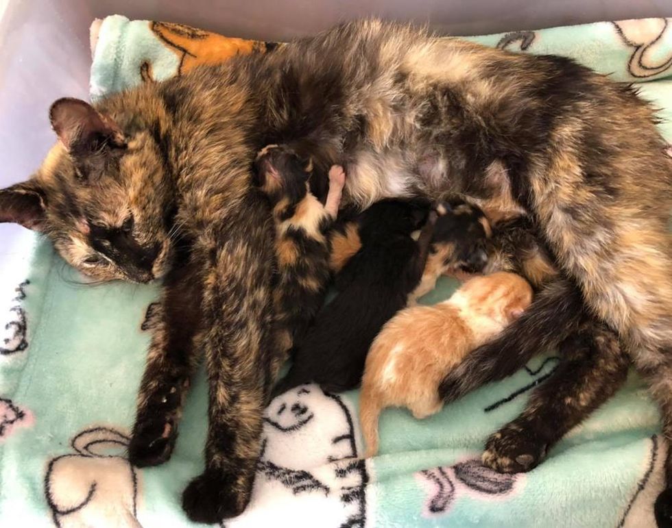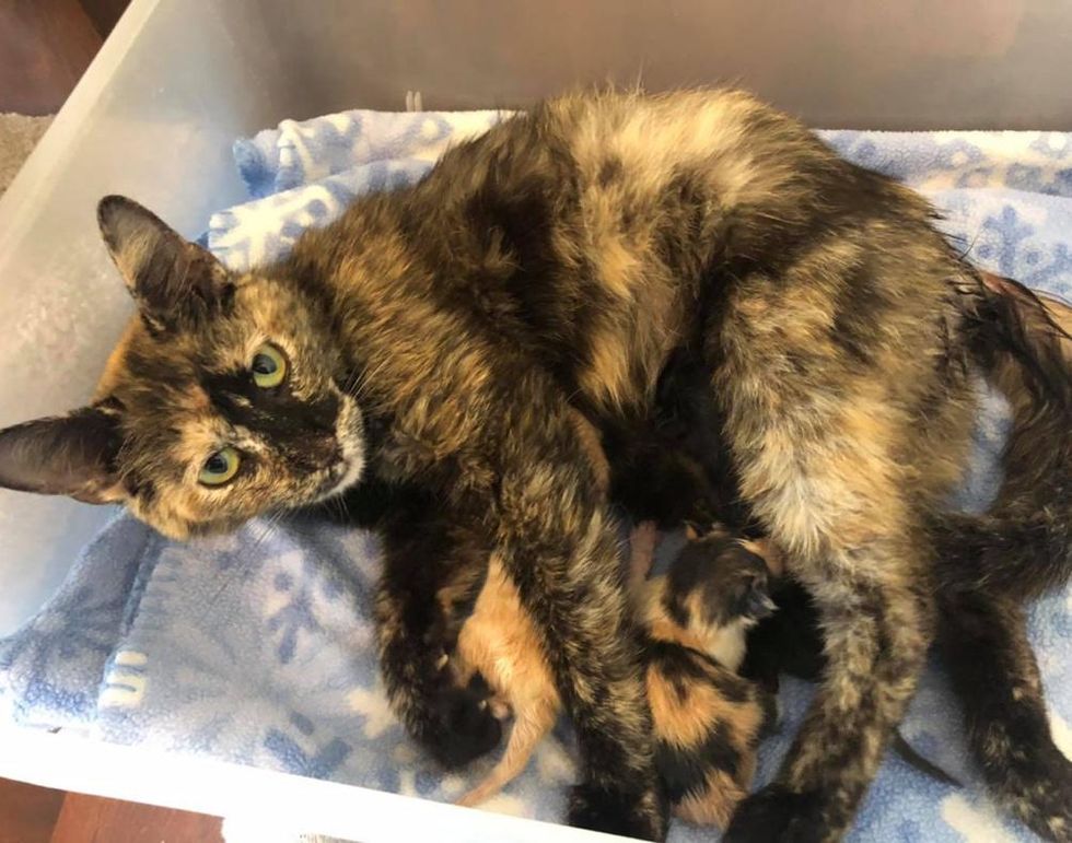 A stray cat who was found covered in snow, got help just in time, so her kittens could thrive.