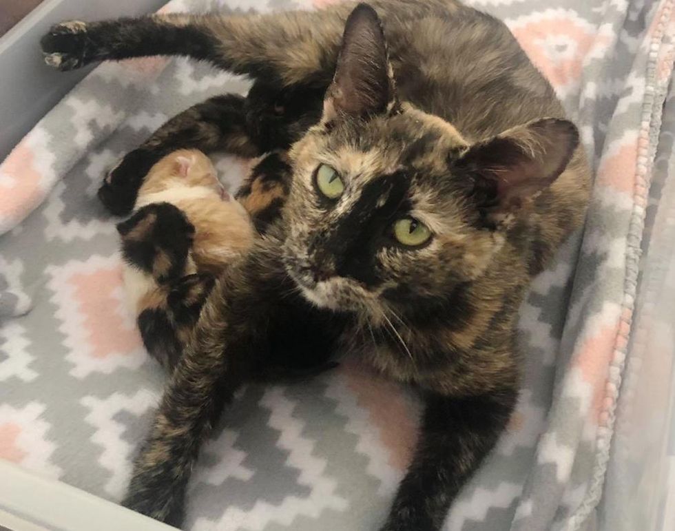 The sweet tortie loves her all-you-can-eat buffet and is starting to fill out a bit. She watches over her babies every step of the way and makes sure that they are kept immaculately clean at all times.