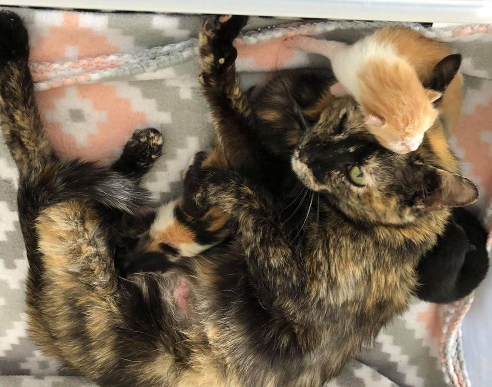 "The kittens are all girls except the orange and white one. We are so very grateful for the wonderful people that stopped to pick her up. Momma Camilla is so lucky to be safe and warm with her little sweethearts."