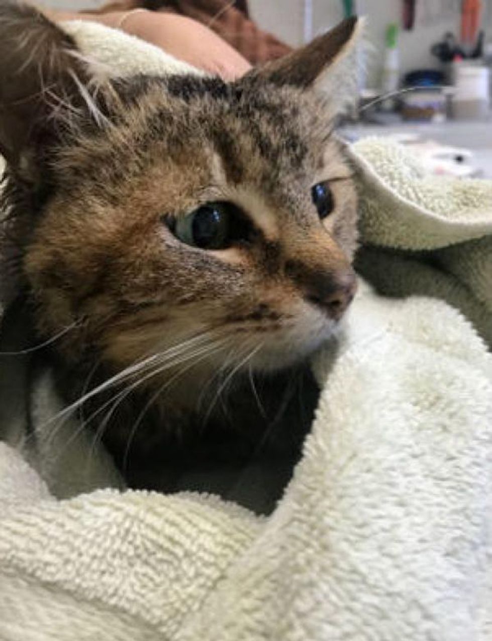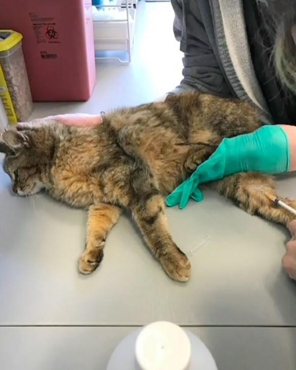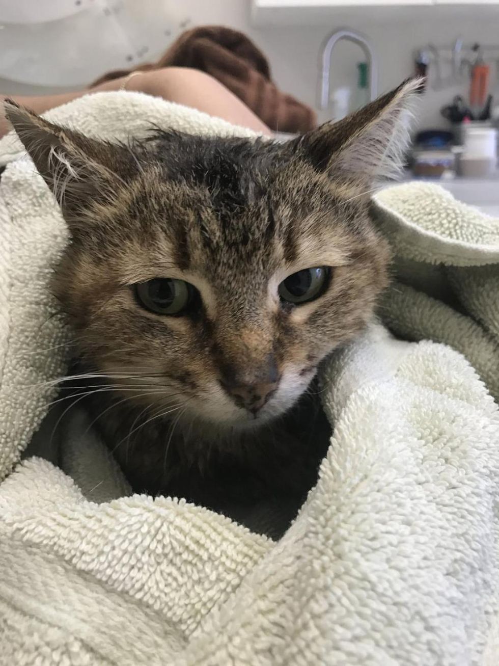 When she arrived, the cat was terrified, huddling up in the corner, frozen with fear. Levin slowly approached her with a towel, and managed to wrap her up in it before taking her into a carrier.
