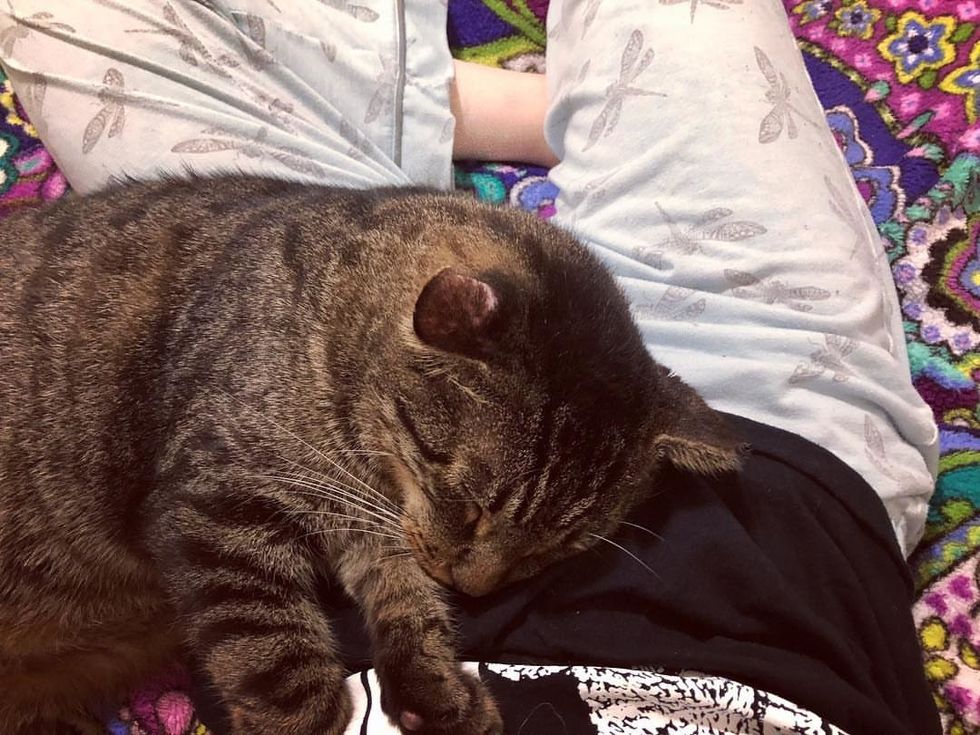 Every day, Sophia waits by the door for her foster mom, Rivka, to come home. She will jump into her lap for extended cuddles, then purr herself to sleep.