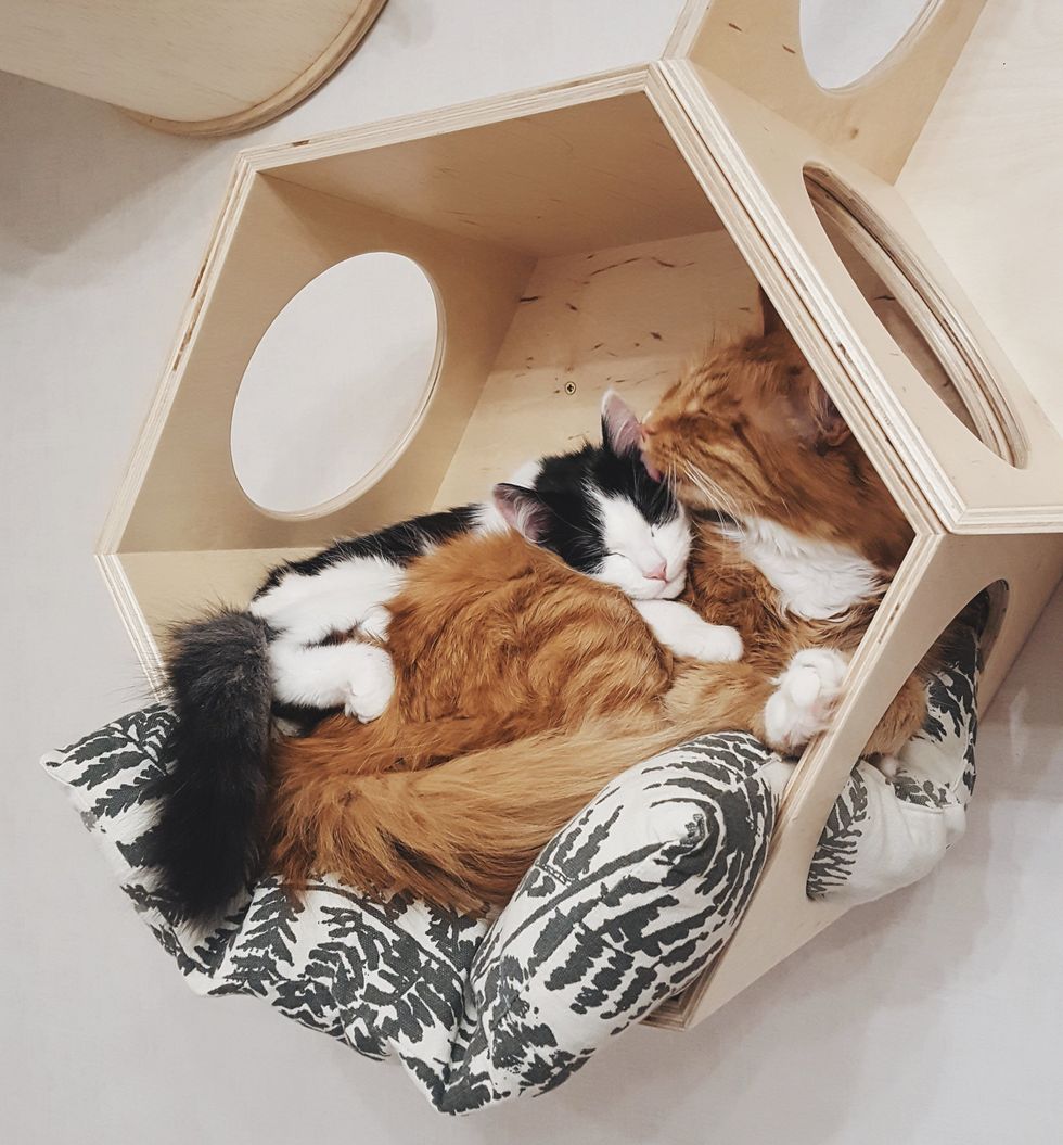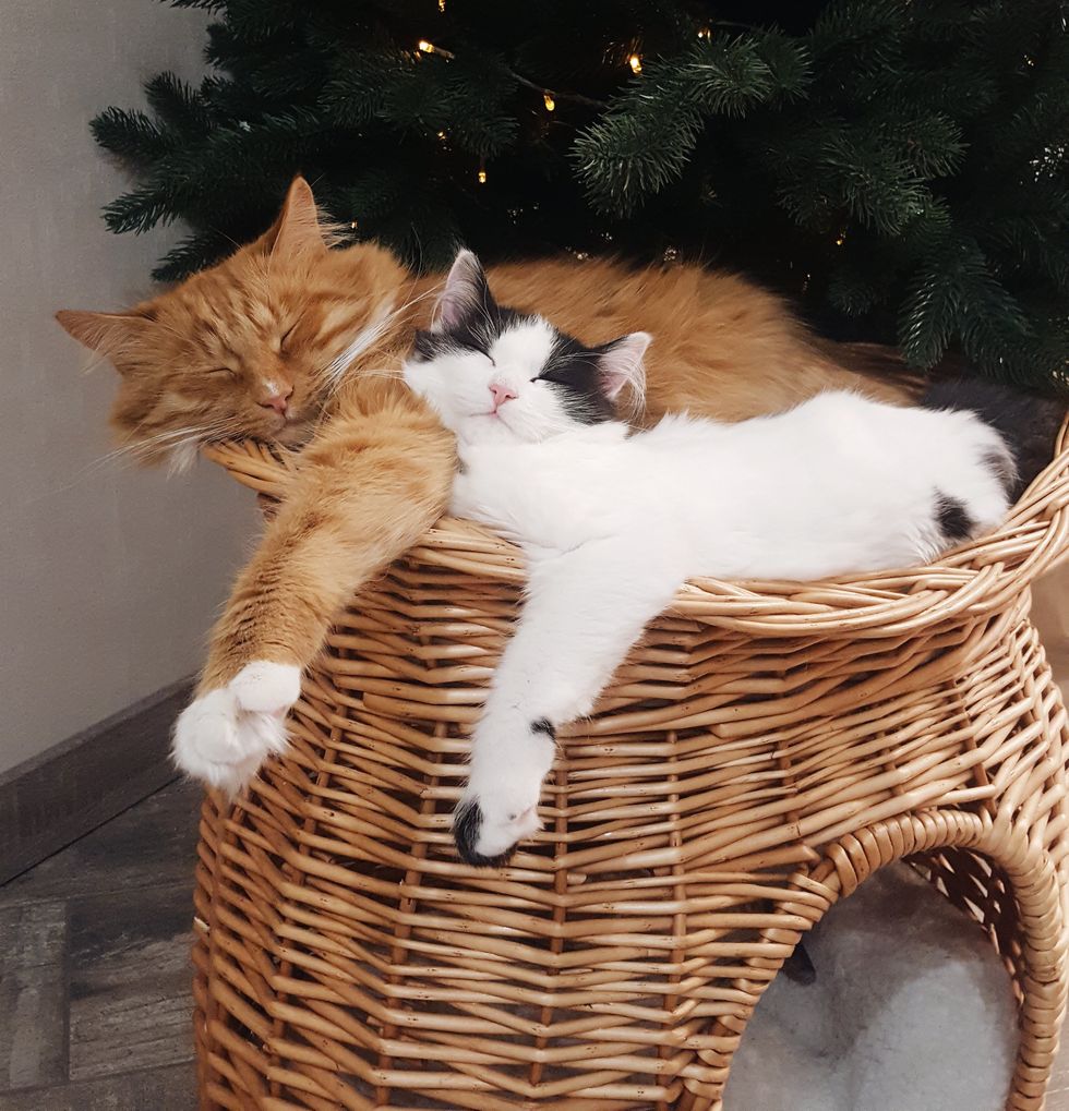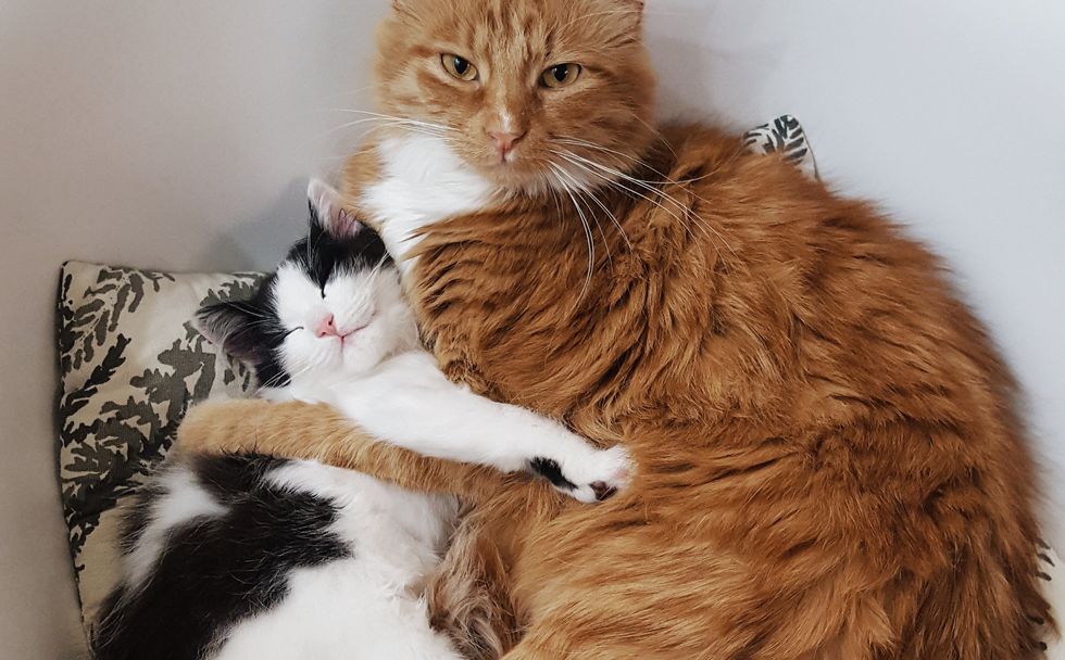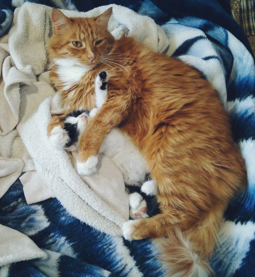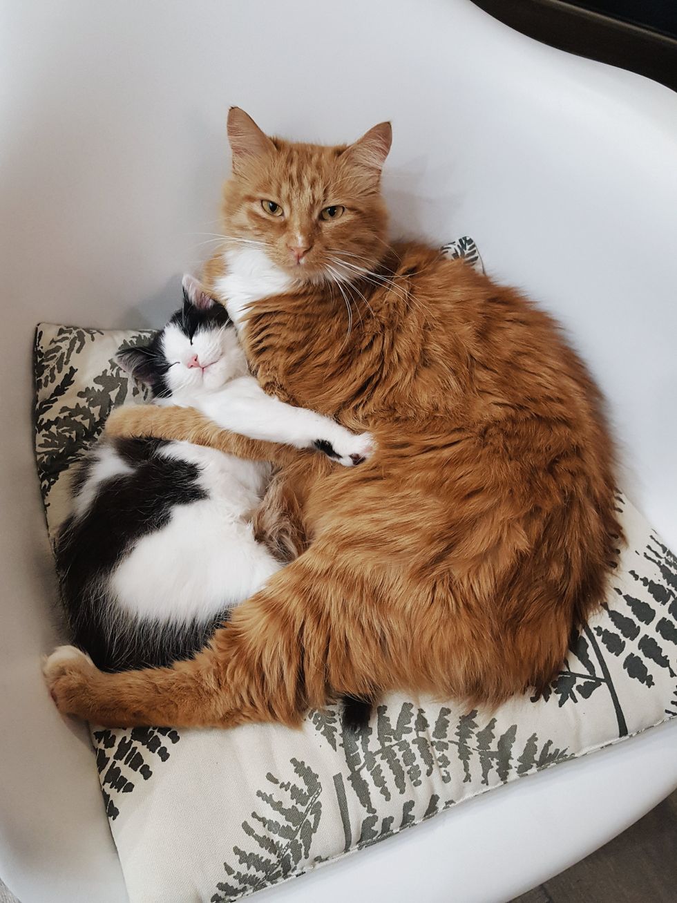 "They sleep together and hug all the time — their favorite thing to do. They love and trust each other very much, and feel relaxed when they are together."