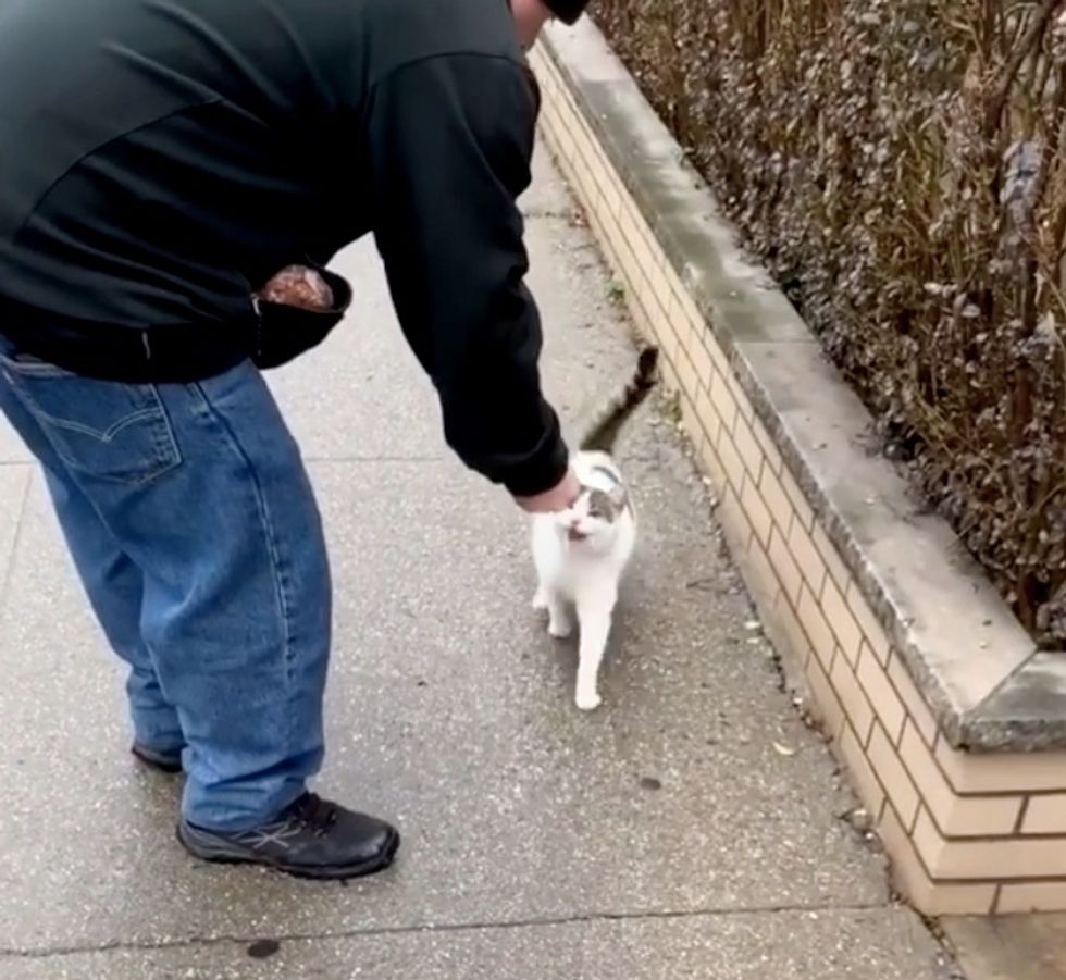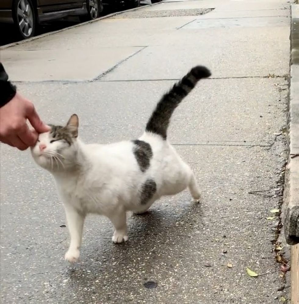 A new cat had shown up to the neighborhood not too long ago. As they arrived at her usual spot, the cat was already there, waiting for them. She immediately came running towards the caretakers, meowing and head bumping them for pets and love.