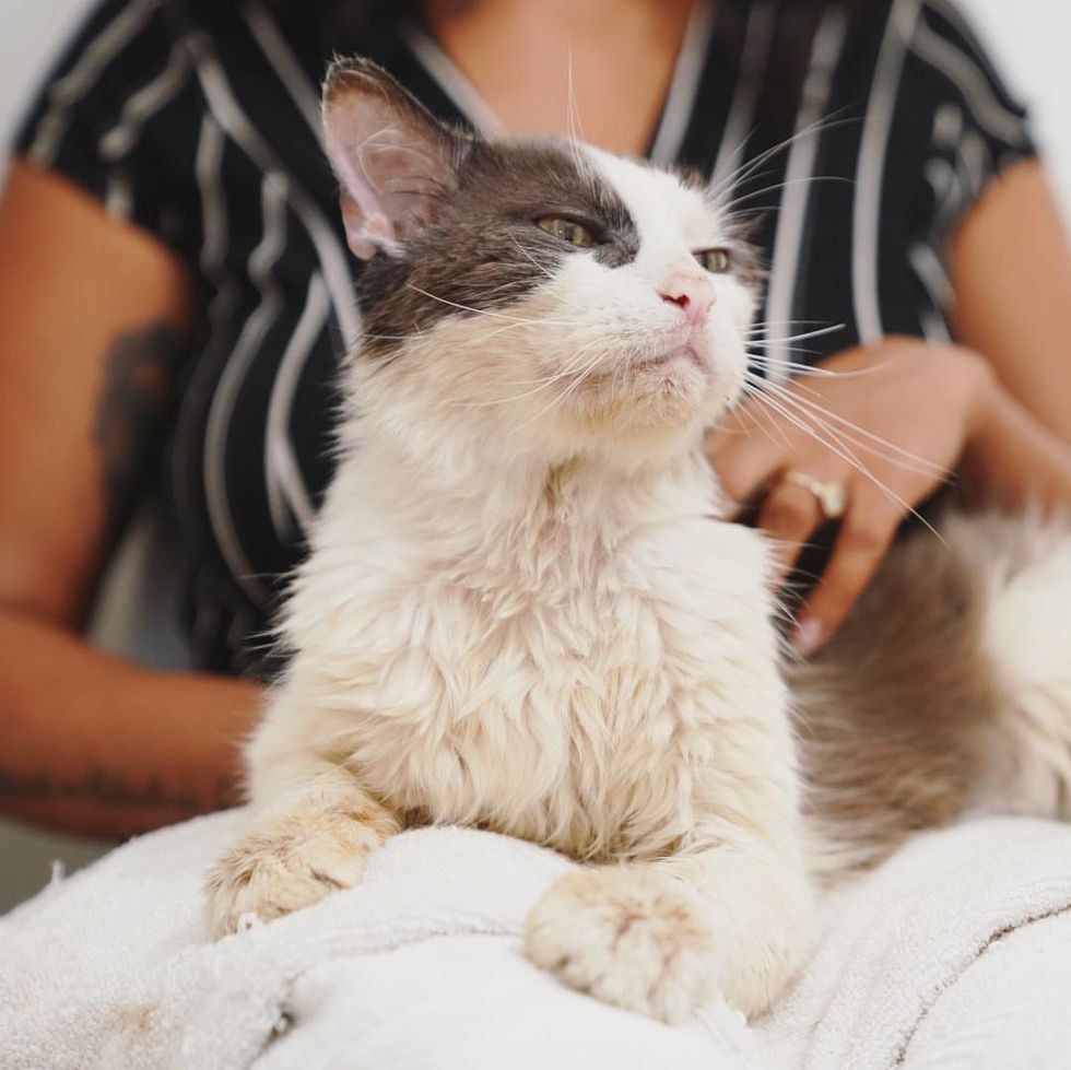 The kitty was so hungry that he walked right in and was ready to leave the street life behind. "He was in rough shape with weight/muscle loss from starvation and dehydration. Easily the dirtiest cat we've ever seen with tons of thick, matted hair clumps, but that can be fixed."