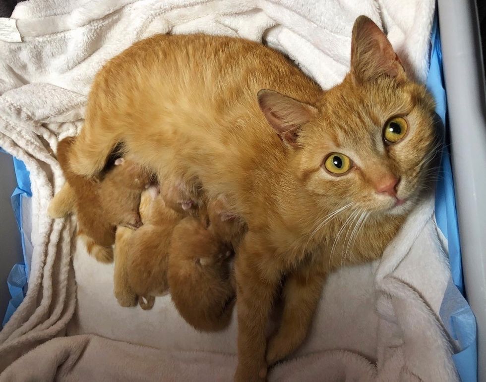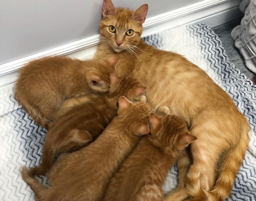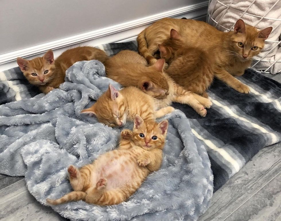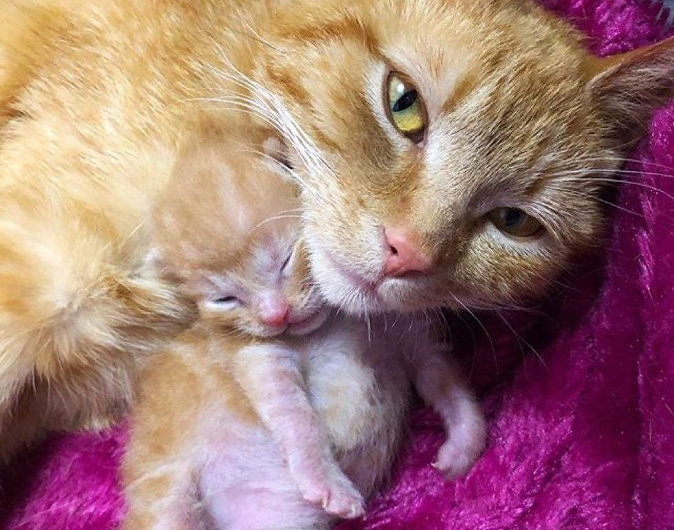Just a few weeks prior to finding this roadside kitten, Mellissa took in a pregnant stray who had been roaming the streets almost all her life. A few days later, the ginger cat, Ginny, went into labor and gave birth to a litter of ginger babies.