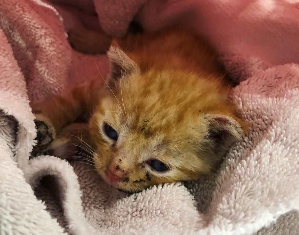 A ginger kitten was spotted on the side of the road, all alone. He was in poor shape and his paws were covered in tar. The Good Samaritans that found him, rushed to get him help.