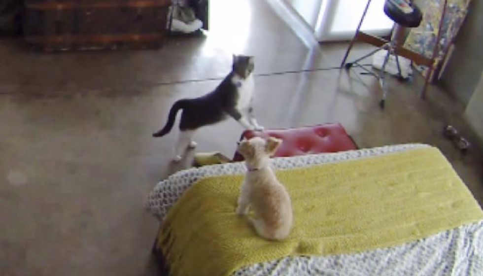A cat surprises his humans when he is able to quiet a barking pup (and even get him to sit) with such a quick and effective way.