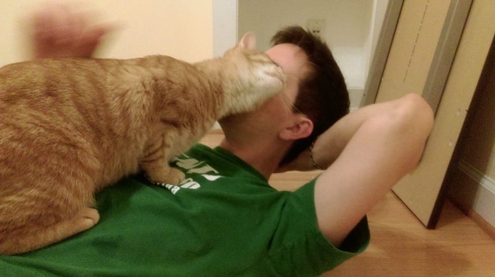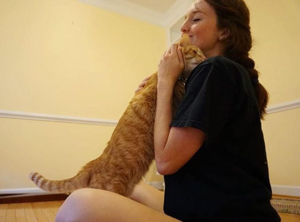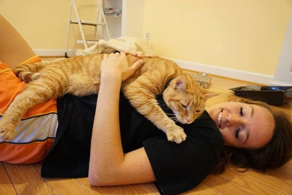 "We went to the shelter just to play with cats, knowing that we wanted one in the future. I've always loved big orange cats, and when I saw him, he reached his head out to me and nuzzled me, then climbed onto my shoulder."