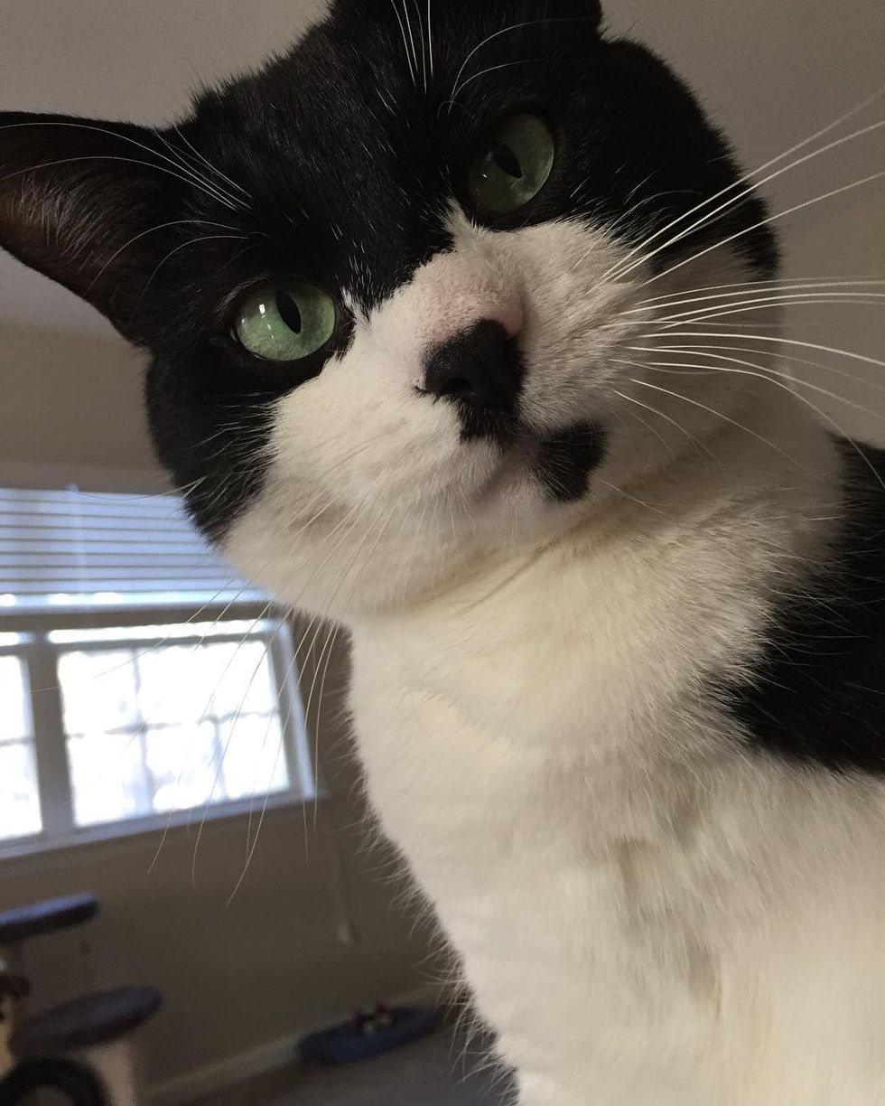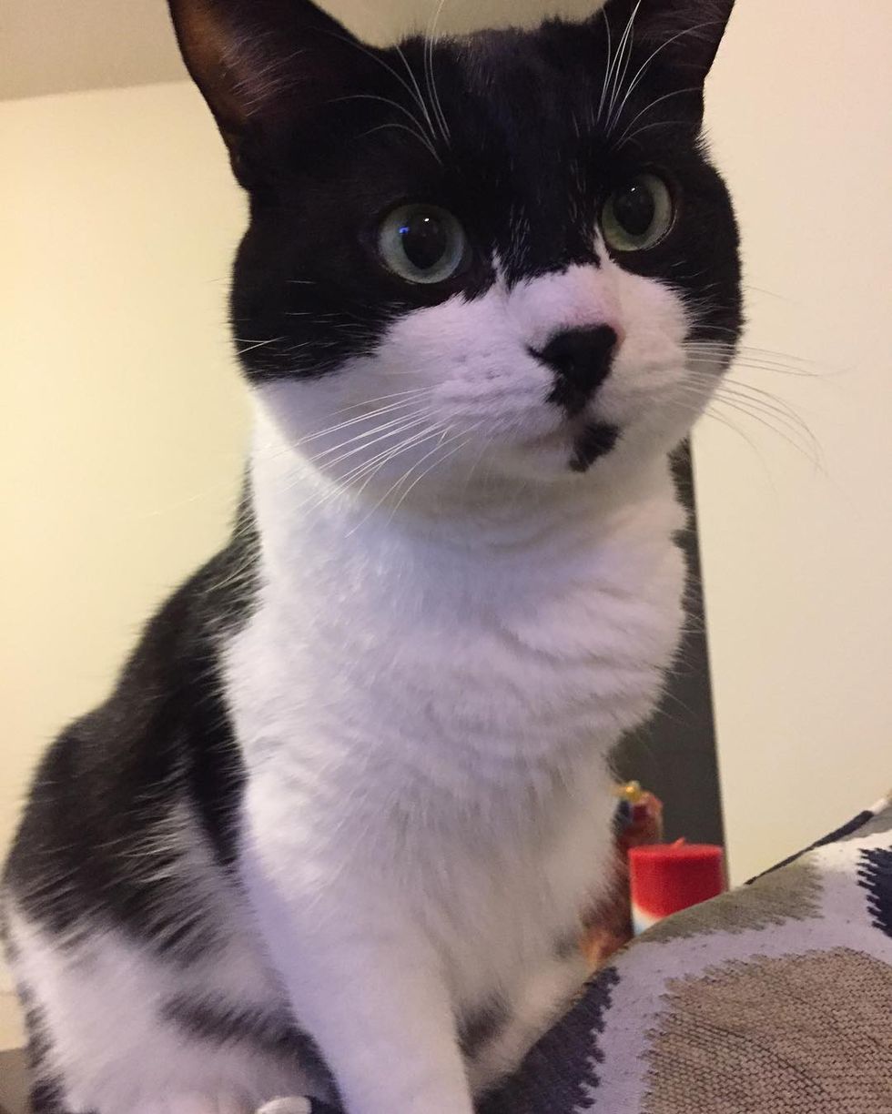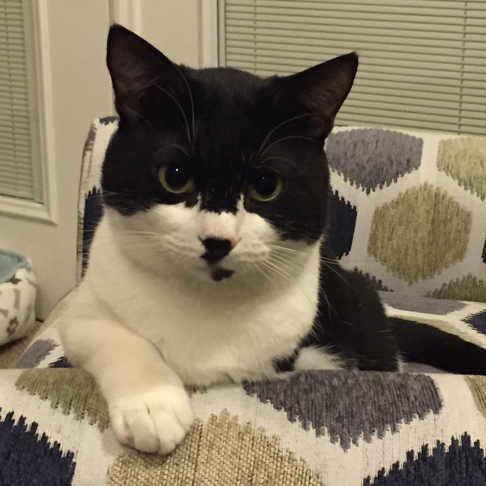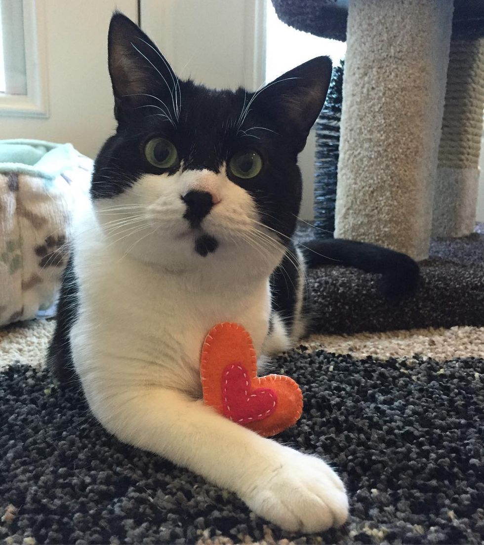 The once frightened, lost shelter cat has blossomed into a happy, playful tuxedo boy, full of personality and quirks.