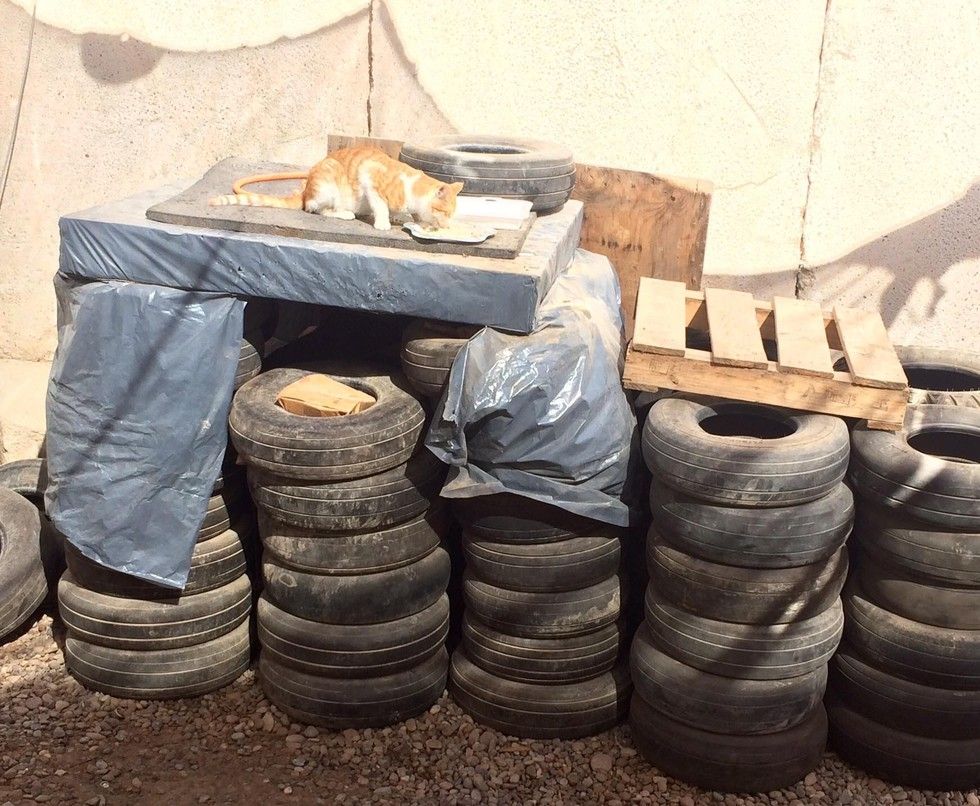 They built a makeshift shelter made of aircraft tires and old pallets so the mom and son could have a roof over their heads. Mr Meowgi and his mom loved it and stayed there whenever it rained.