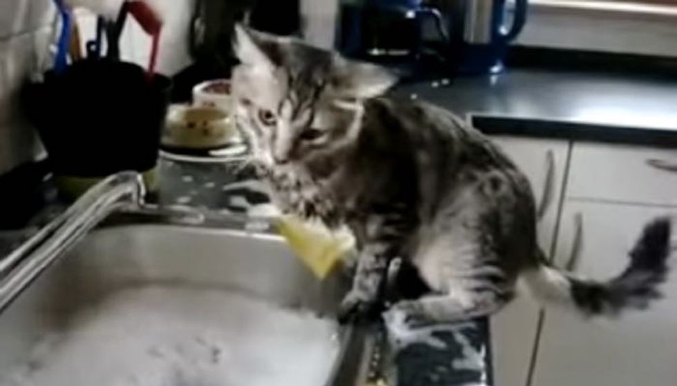 A tabby cat is splashing water in the sink with all his might. From afar, one might think a half soaked kitty is helping his humans wash their dishes. What a good kitty! Once you get close to the action, you will see the kitty isn't so much into the chore as he is having fun with the suds! It's all good. :)