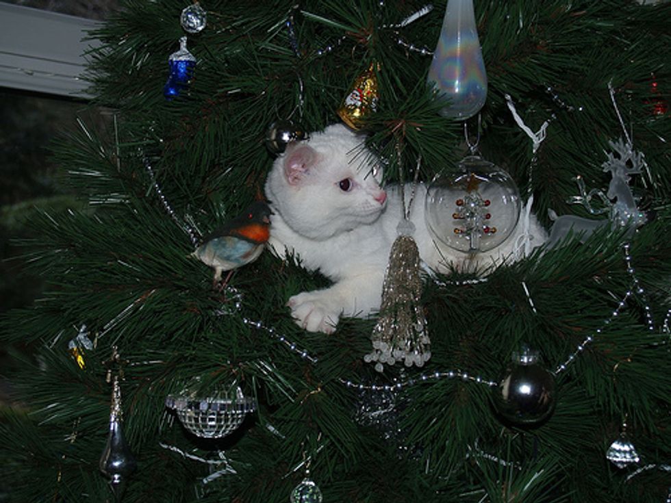 Cats love ornaments hanging on a Christmas tree. They will try to get one off the tree and kick it across the room if they could. The kitten from the video just found his favorite ornament, hitting it with his paws and being very naughty.