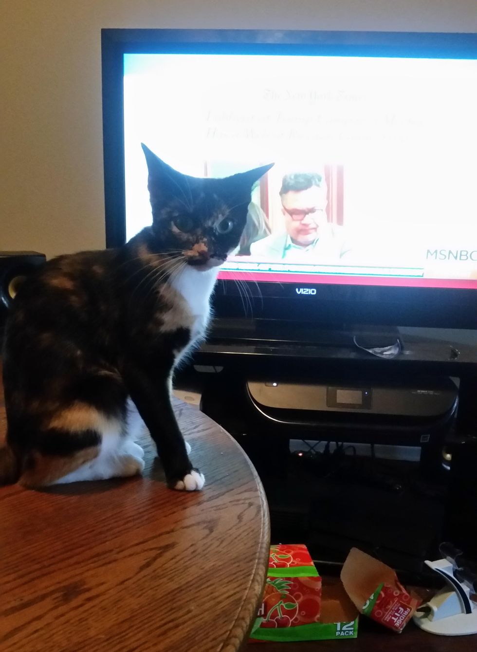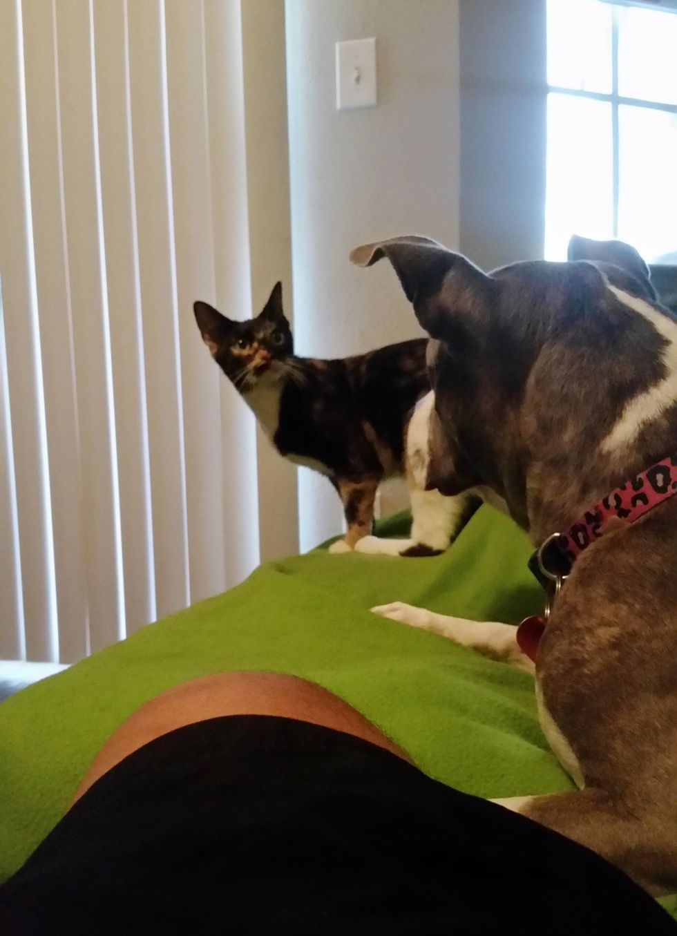 The smart tortie girl is safe from the storm and has a human to look after her and a canine friend to play with.