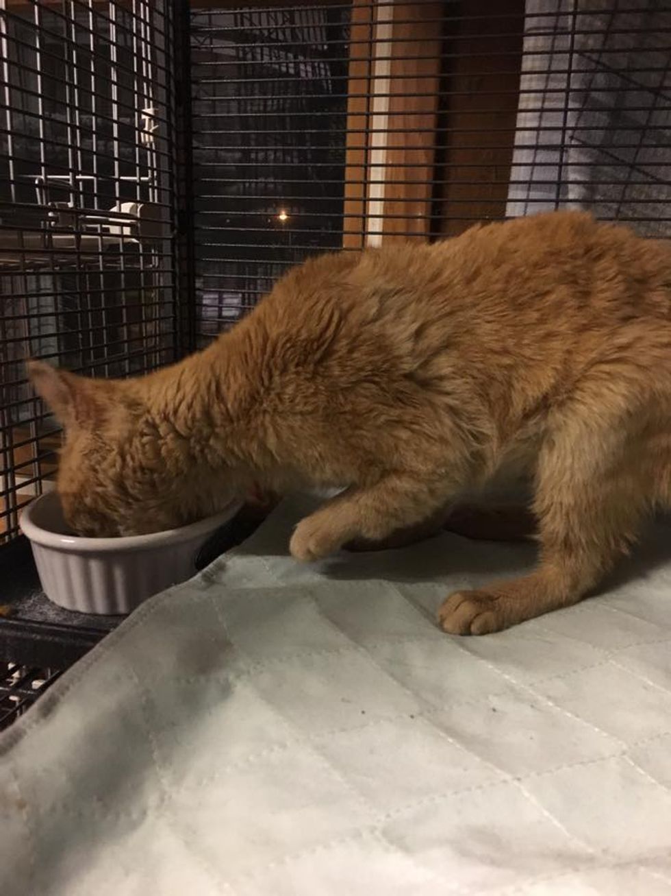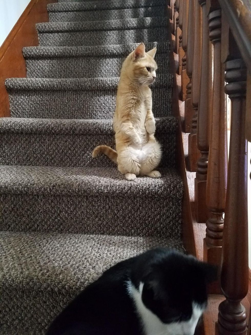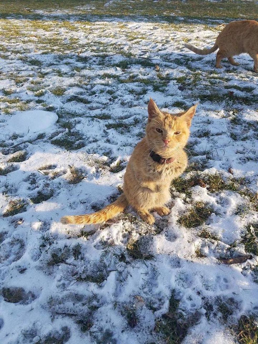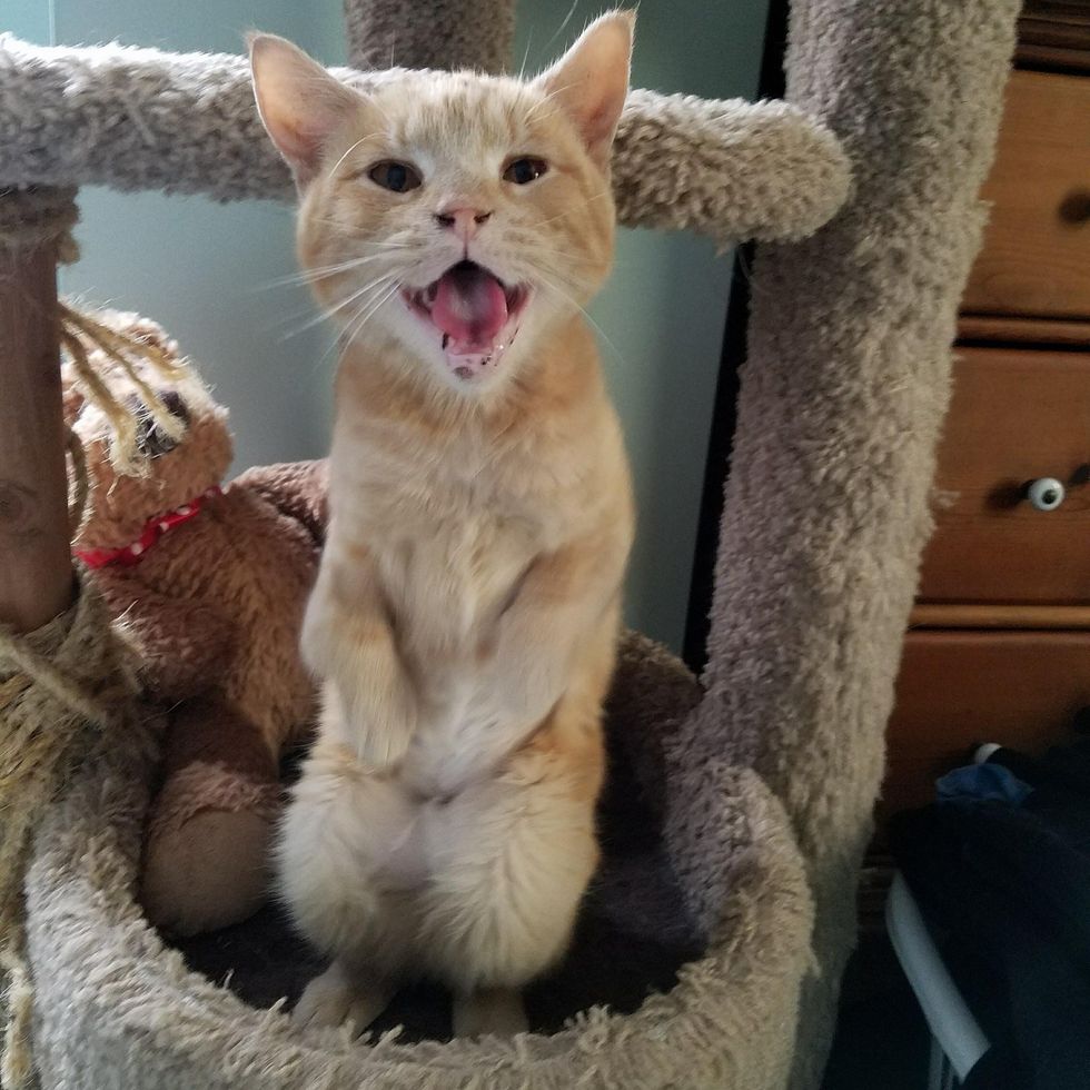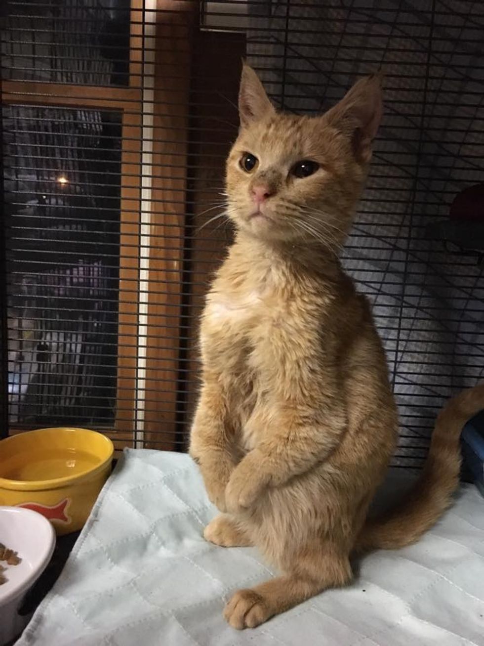 A ginger kitty from a cat colony was found walking on her hind legs. She has two bent front legs, but nothing can slow her down.