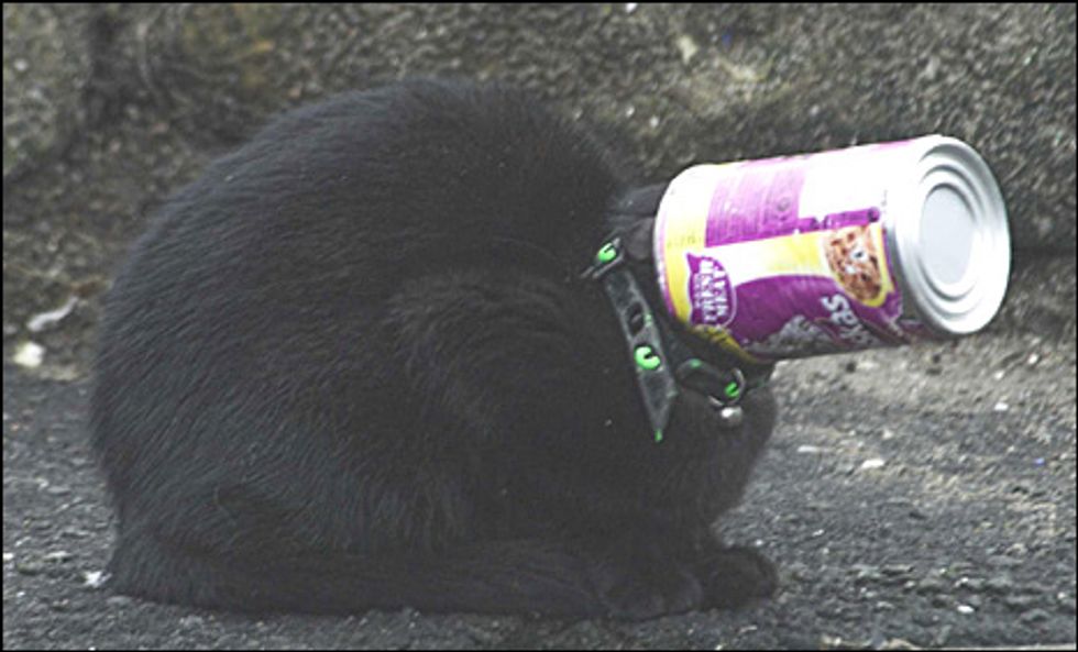 The cat was found by staff at the Fife rescue center with a Whiskas tin stuck on her head. Colin Seddon, manager at the rescue center believed that the cat was probably scavenging for food, lodged her head in a litter can and was not able to get out.