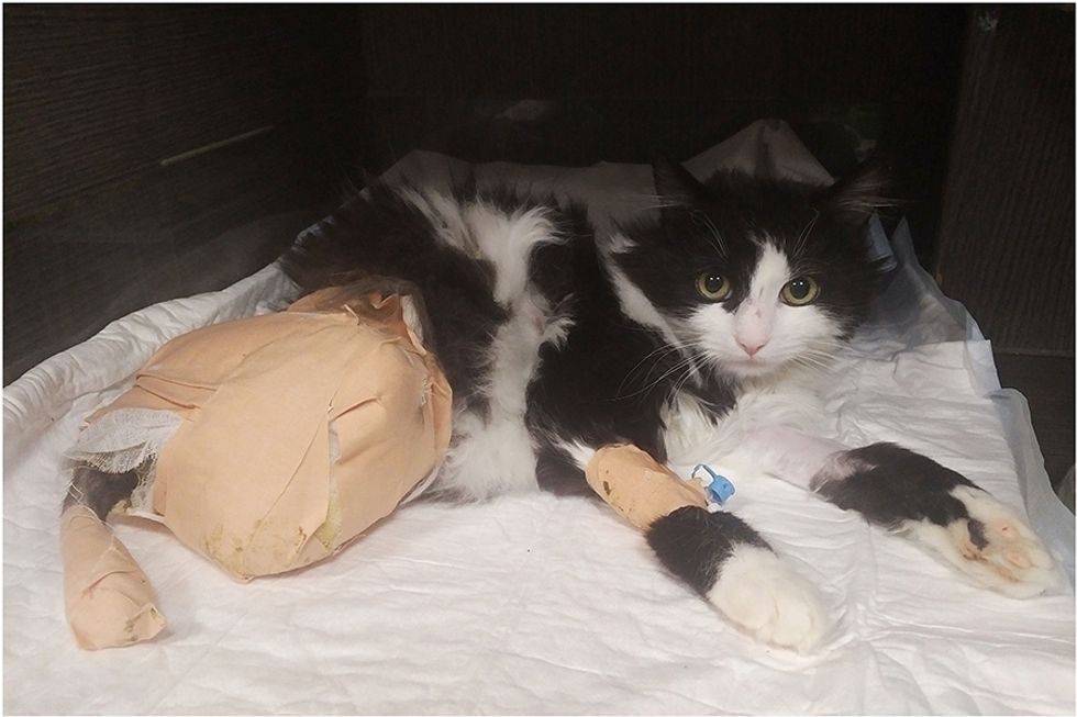 The black and white cat was found in a small village in North Bulgaria one day last April with severely crushed hind legs. They suspected that he was run over by a passing car or train.