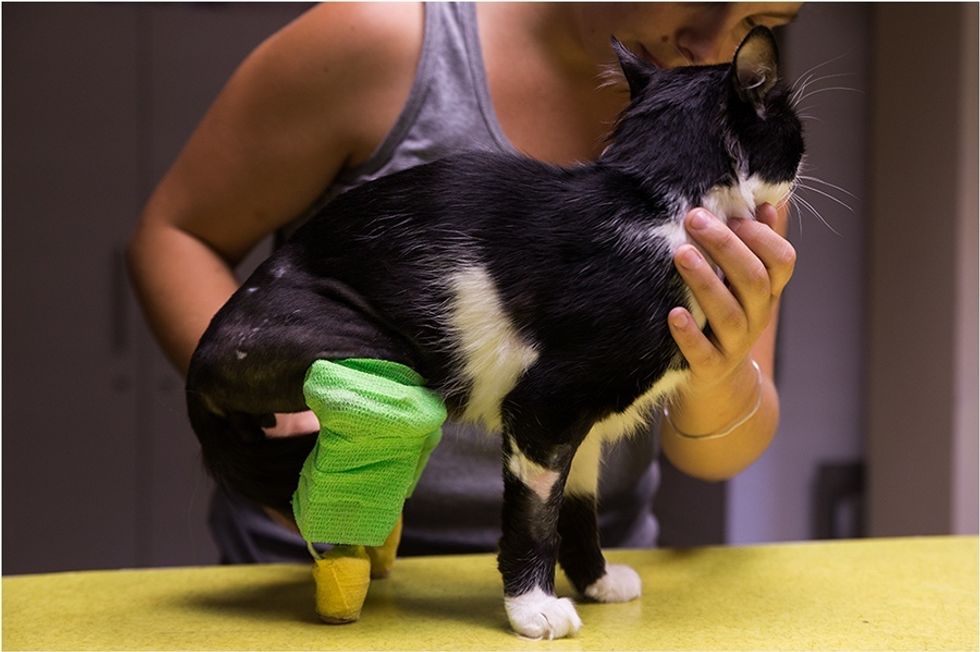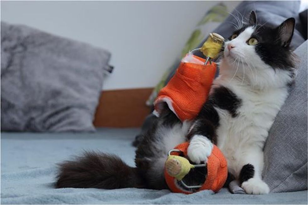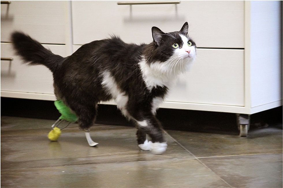 The vet fitted the kitty with two tiny polymer-and-rubber paws mounted on titanium stems.