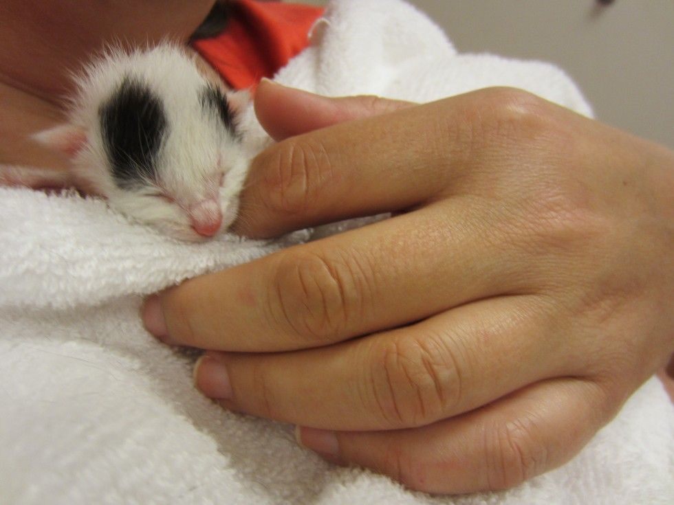 "At 10 days old, the kitten was still the size of a stick of gum. She was named Jaax after the vet (Dr. Jennifer Jaax) who saved her mom's life."