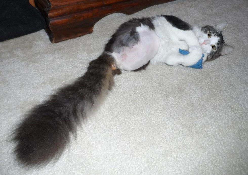 The tiny kitten that they found in the feral colony, has grown into a magnificent cat with a floofy tail that helps him walk, jump, climb, and do all the things like other cats.