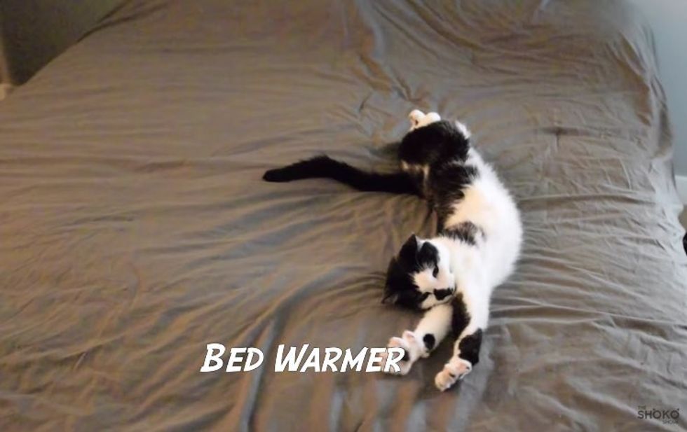 He warms the bed during the day and night. It's hard work!