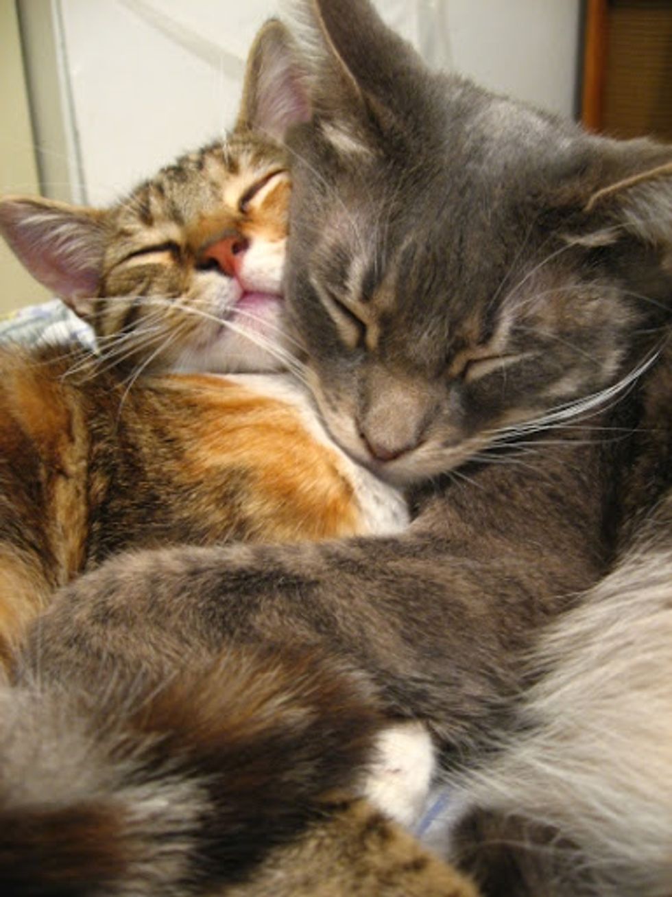 "My boyfriend and I adopted them as kittens from the SPCA, a year apart. They are great friends and love to cuddle with each other."