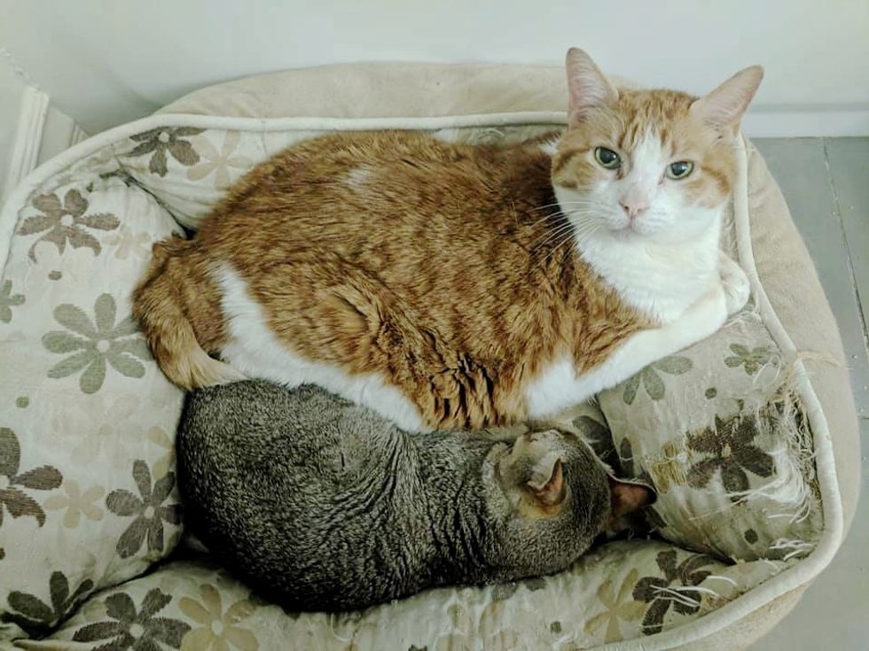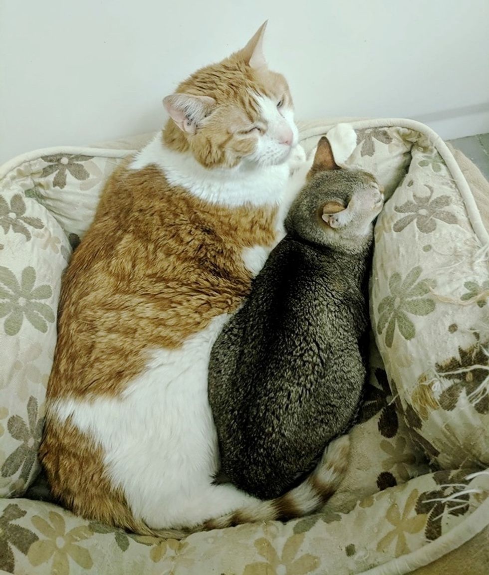 "They are attached at the hip. Danny is Sandy's protector and when I enter the room, he often stands over her and she burrows her head in him," she added. "They are always found cuddled up on a large cat bed together."