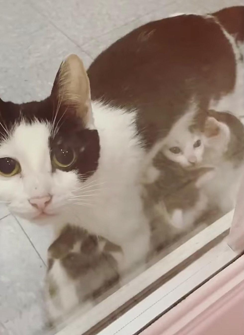 Two cats who have raised their eight kittens together, wait at the glass door at the shelter every day.