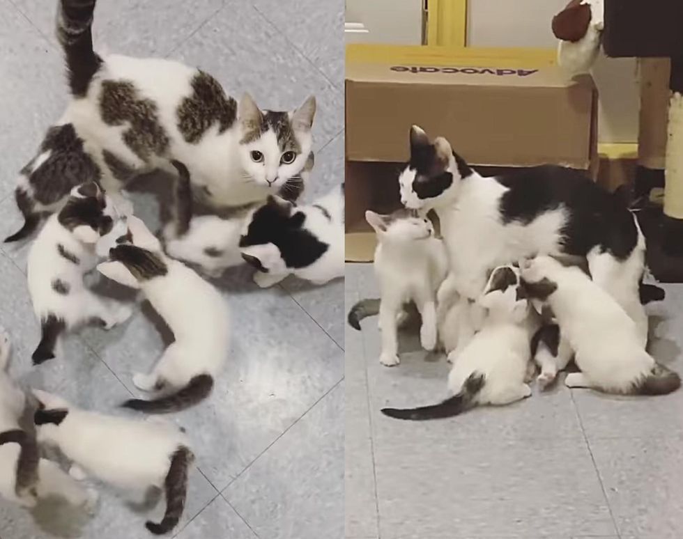 The sister cats, Xeno and Ripley, managed to have the kittens at the same time and began to raise them together. They have been co-parenting their little ones who constantly keep them on their toes.