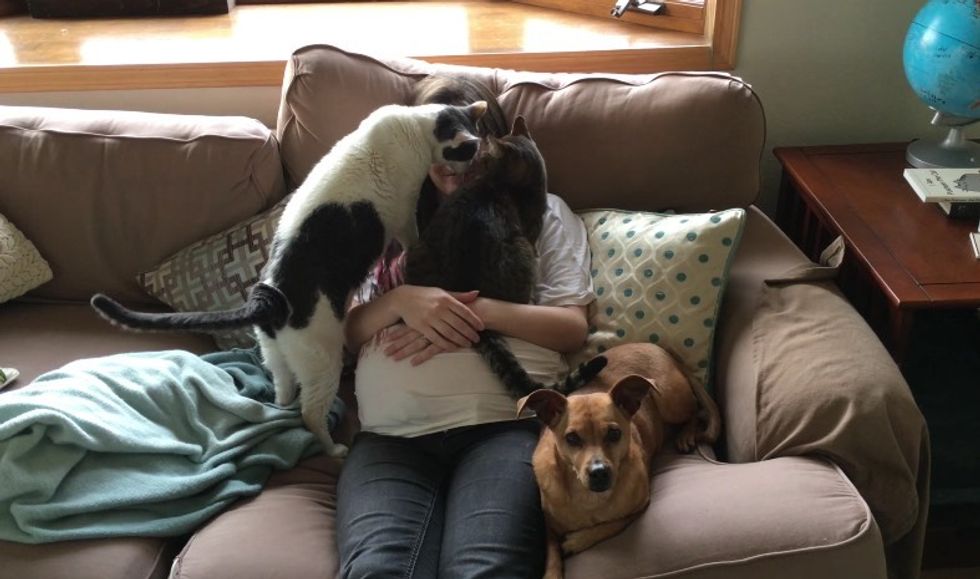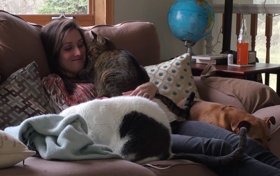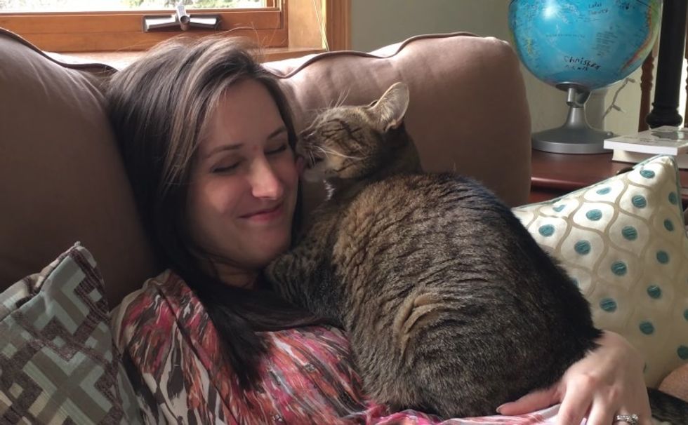 Sparta the cat senses a baby coming from his pregnant human mom and has been cuddling with her and keeping her company.