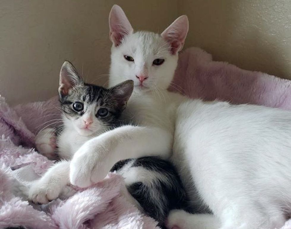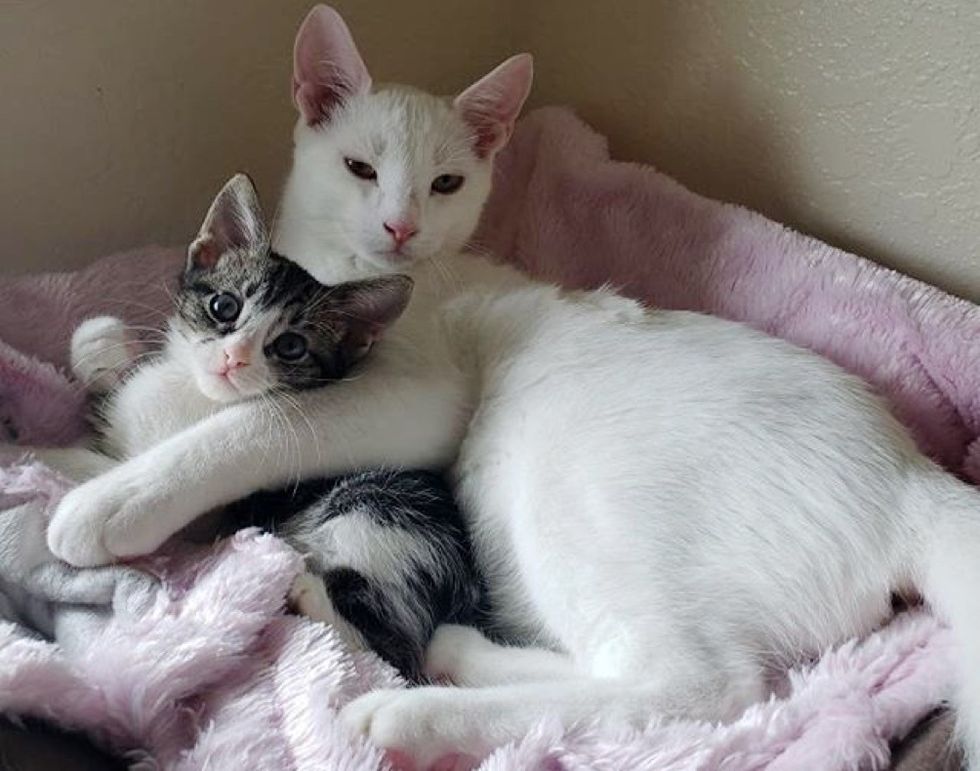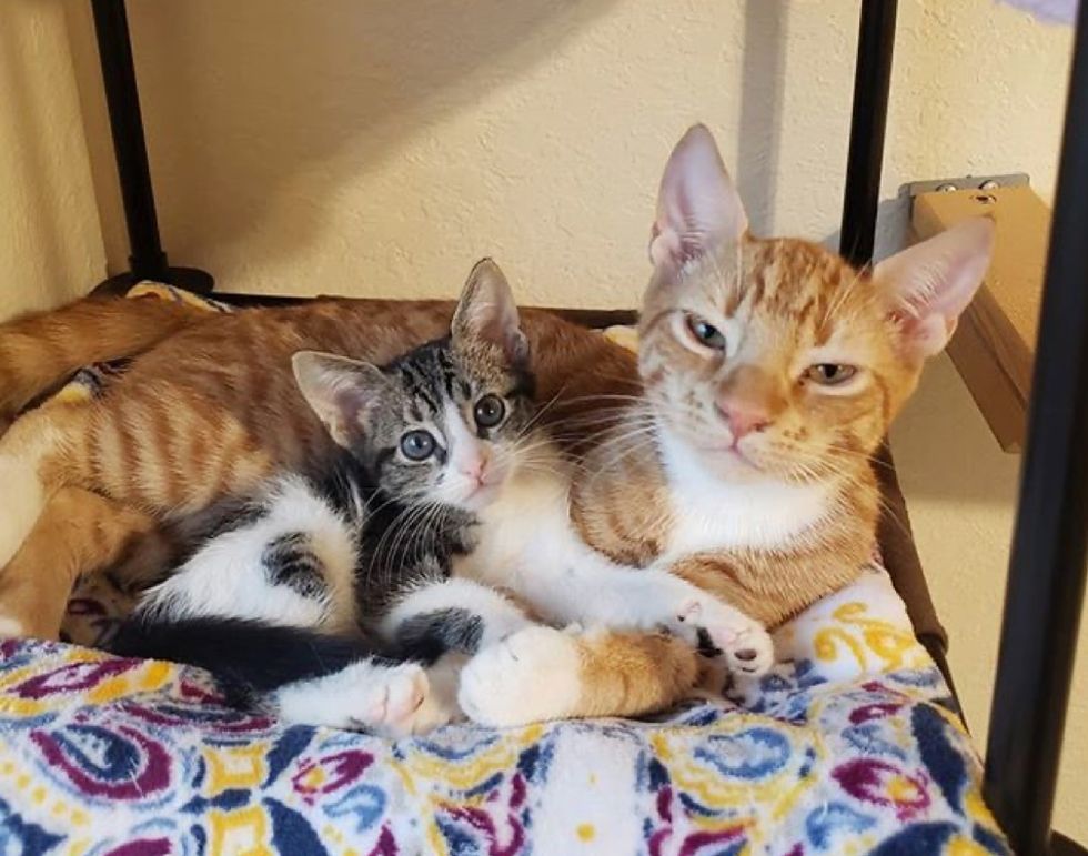 Mango and Coconut, a bonded pair, shower their little foster sister with cuddles and licks. They show her the ropes and make sure she is never alone when she naps.