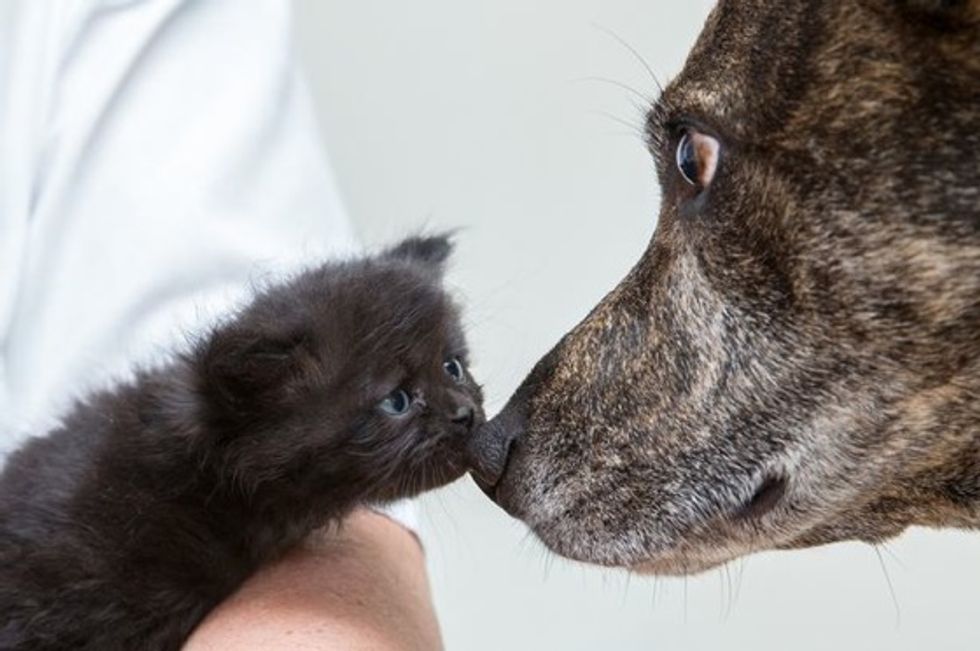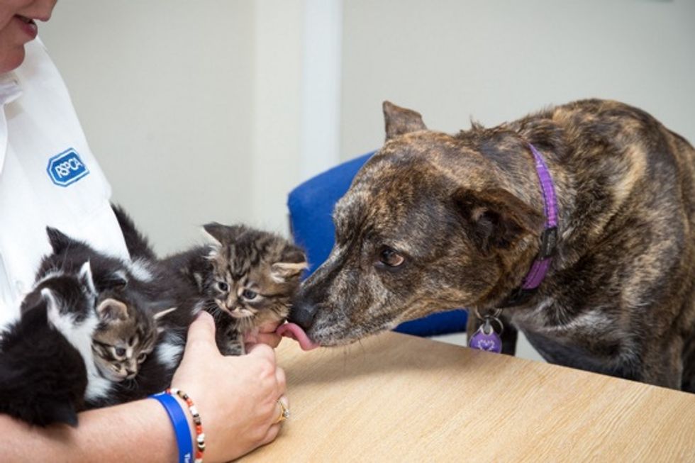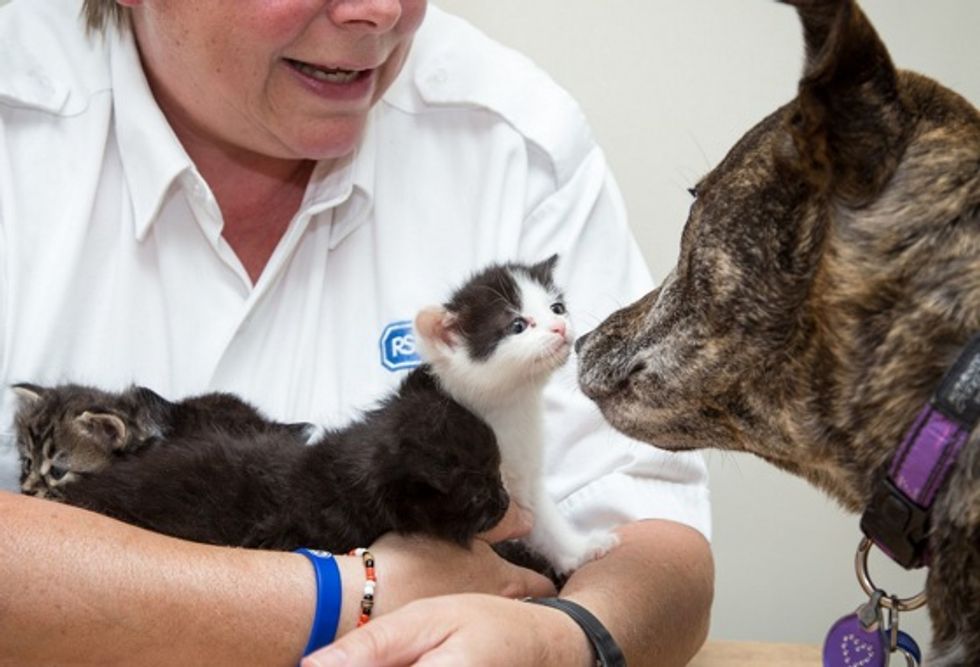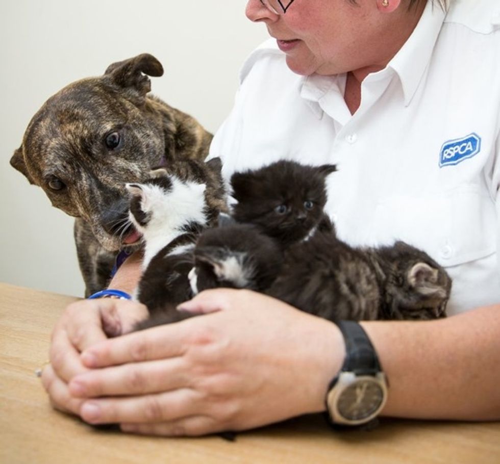Meg the 3-legged rescue dog became a surrogate mom to a litter of five kittens that he helped rescue from the ceiling of the Rochdale’s RSPCA animal center.
