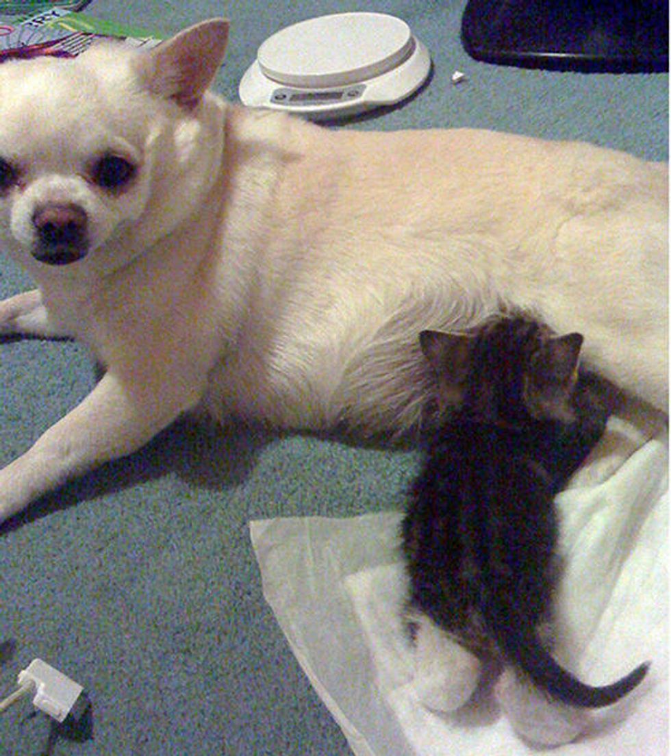 A tiny stray kitten found a Chihuahua to be her new mom. She adopted the kitten and even produced milk despite having never had puppies.